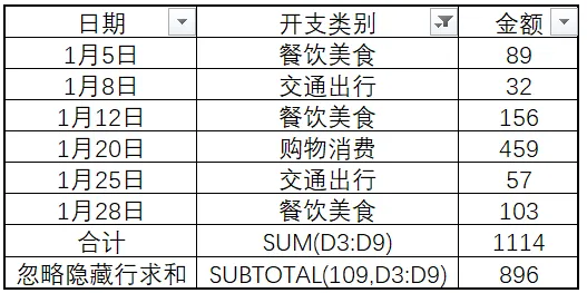 SUM函数求和会计算隐藏区域,使用【=SUBTOTAL(109, 数据区域)】函数计算可以忽略隐藏单元格,如图隐藏“水电煤气”项后,可以忽略求和