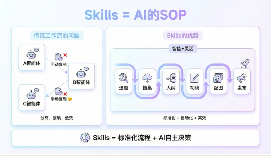 而Skills,是别人已经教会它的一套工作流。
