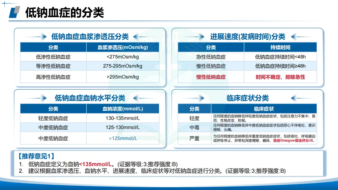 定义:血钠<135 mmol/L(证据等级3,推荐强度B)。