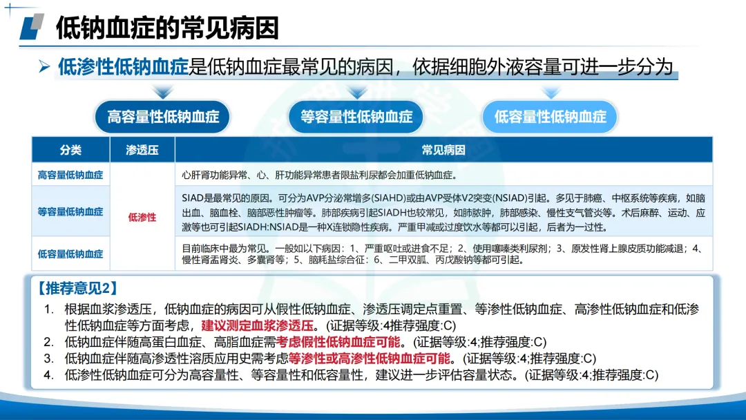 常见病因:低渗性低钠血症最常见,按容量状态分为高容量性、等容量性、低容量性。🚫需警惕假性低钠血症(伴高蛋白血症、高脂血症)及等渗/高渗性低钠血症(伴高渗透性溶质应用史)。