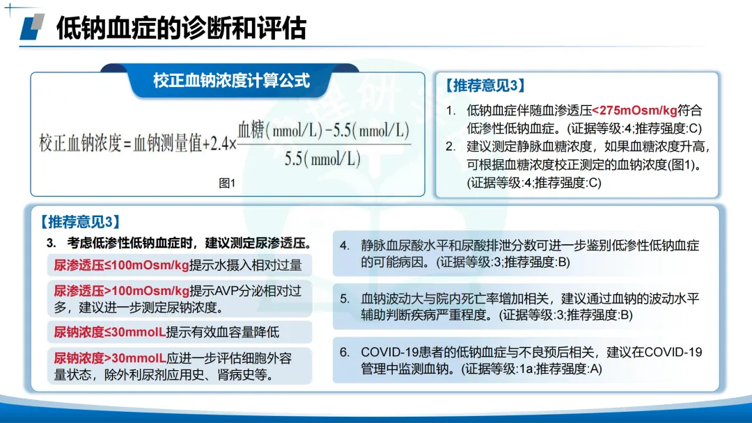 校正血钠:血糖升高时需校正(公式:校正血钠 = 测量值 + 2.4×血糖-5.5)。
