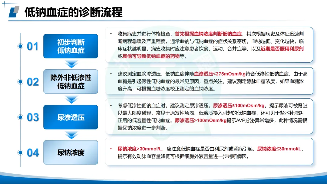 4、尿钠>30mmol/L→注意利尿剂或肾病;≤30mmol/L→有效动脉血容量降低。