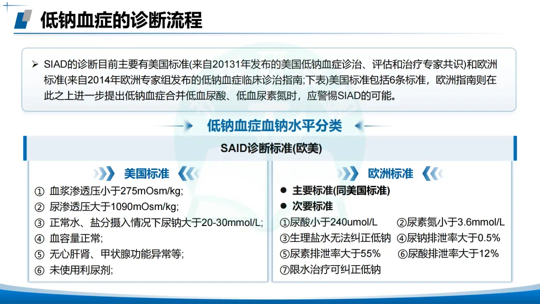 SIAD诊断标准(抗利尿激素分泌异常综合征):参考美国(6条)与欧洲(附加低血尿酸、低尿素氮等次要标准)。
