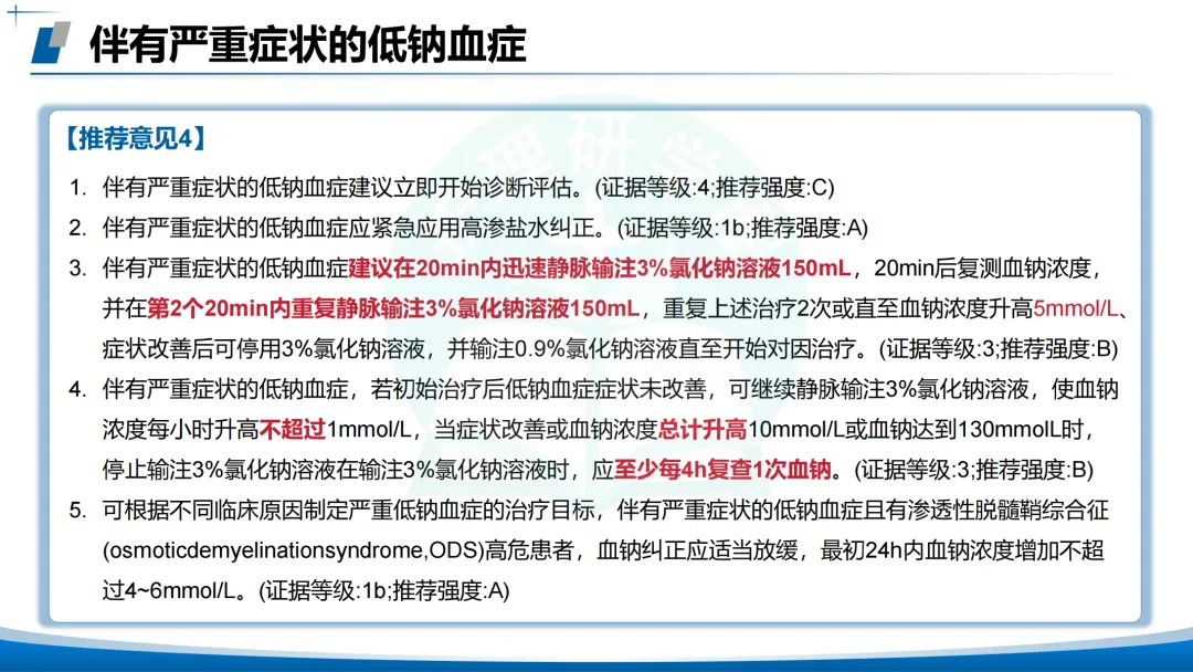 伴有中度严重症状的低钠血症:立即评估,可单次输注3%氯化钠150 mL,⏰24小时血钠升高≤10 mmol/L。