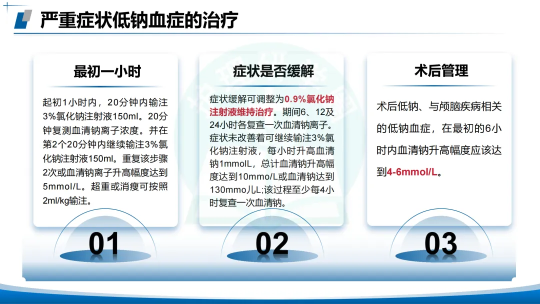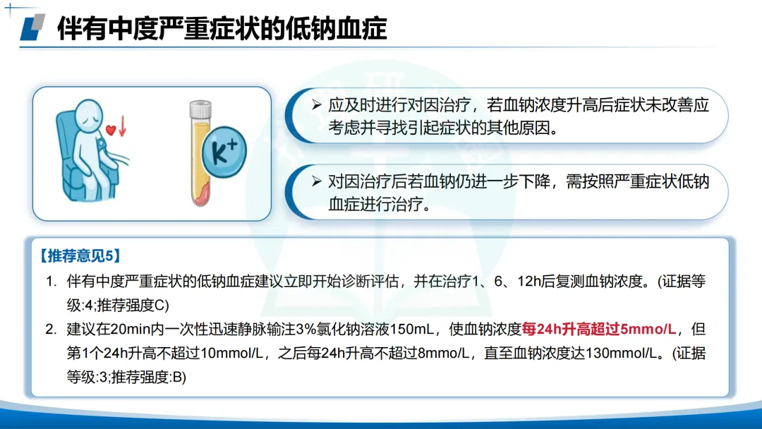 伴有严重症状的低钠血症:立即诊断评估,紧急使用3%氯化钠静脉输注。方案📖20分钟内输注150 mL,20分钟后复测血钠,可重复2次或直至血钠升高5 mmol/L/症状改善。