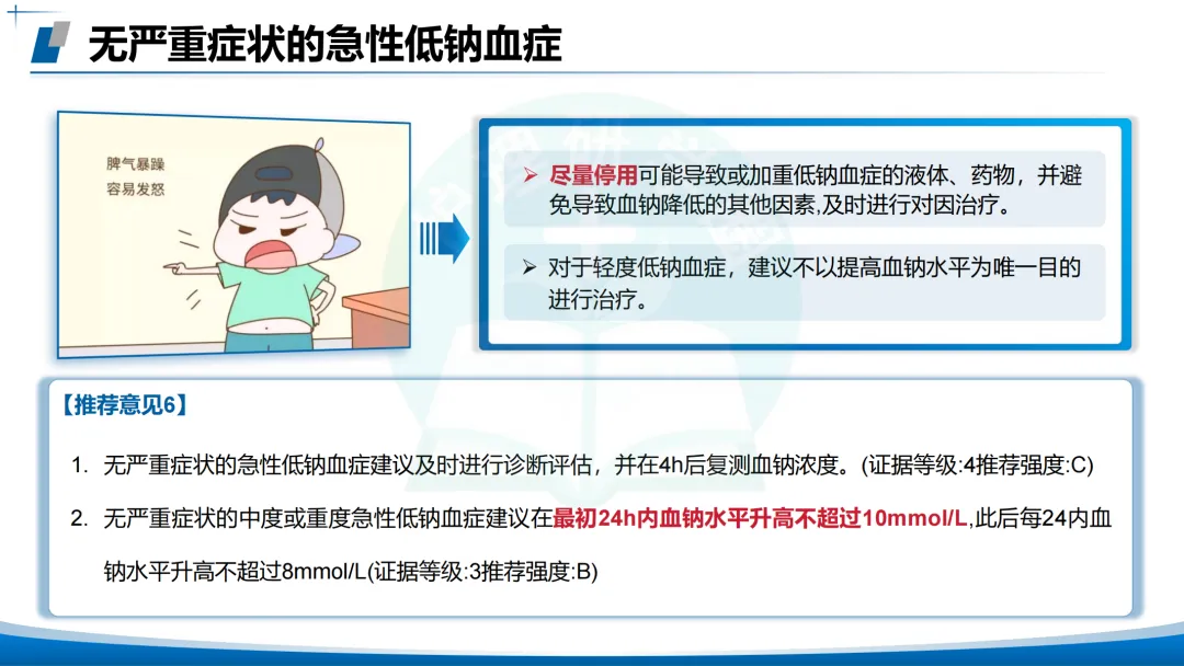 无严重症状的急性低钠血症:停用🚫致低钠药物💊/液体,对因治疗;24小时血钠升高≤10 mmol/L。
