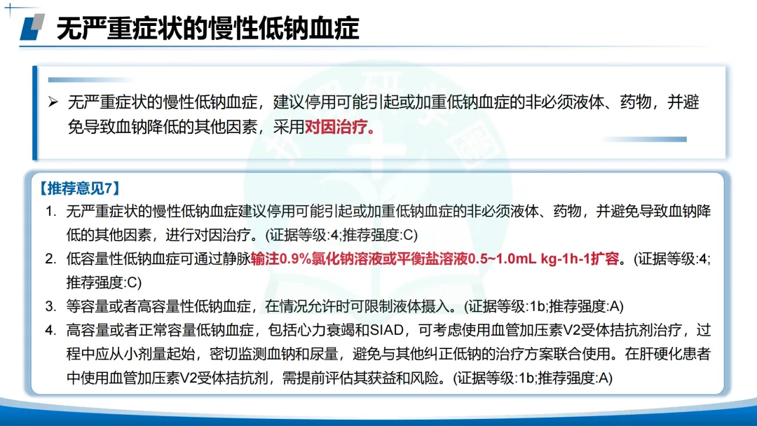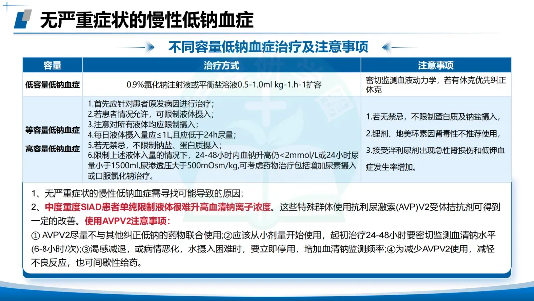 无严重症状的慢性低钠血症:对因治疗,根据容量状态选择💕。低容量0.9%氯化钠或平衡液扩容。等容量/高容量限制液体摄入,考虑AVP V2受体拮抗剂(托伐普坦等),从小剂量起始,密切监测。