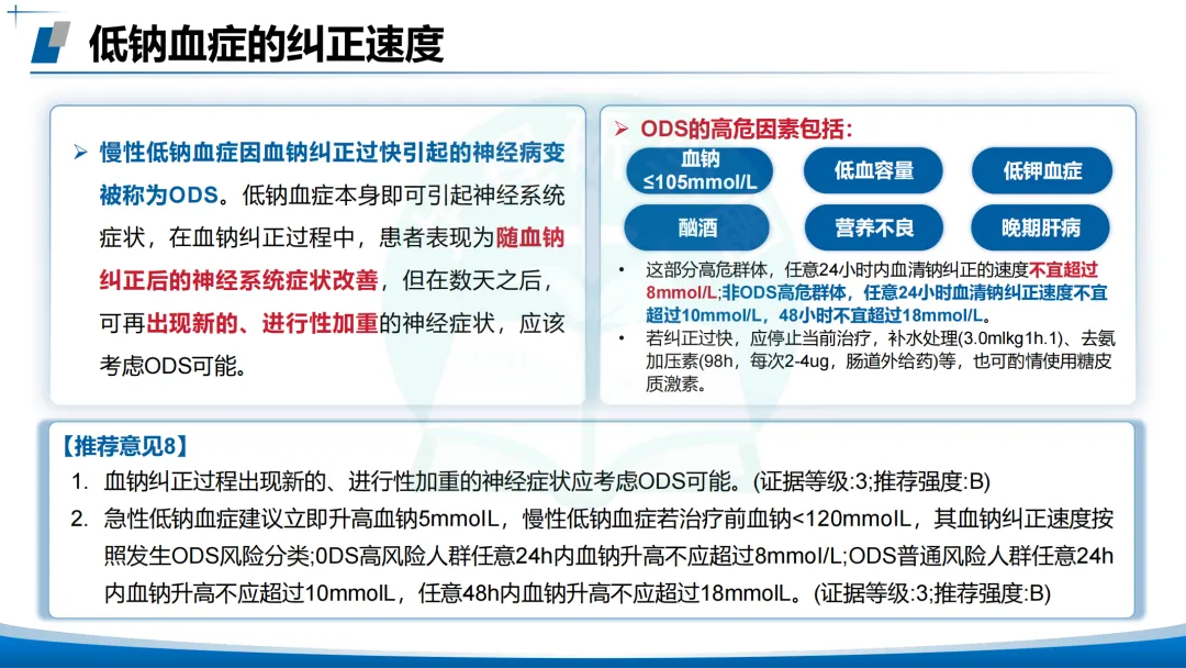 纠正速度与ODS风险:ODS高危因素低钾、营养不良、肝病、酗酒🍺等。
