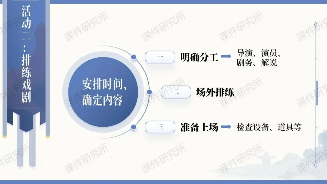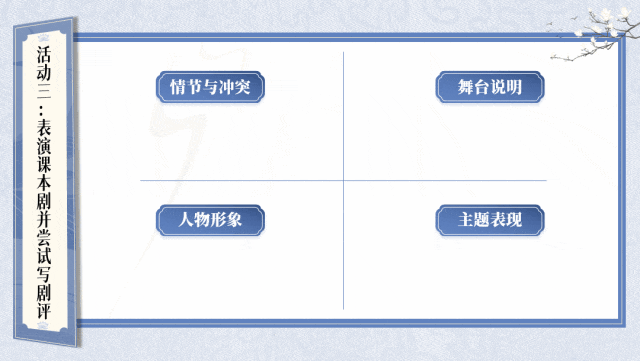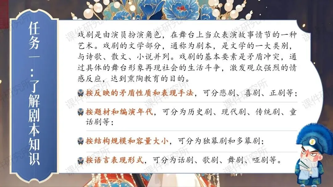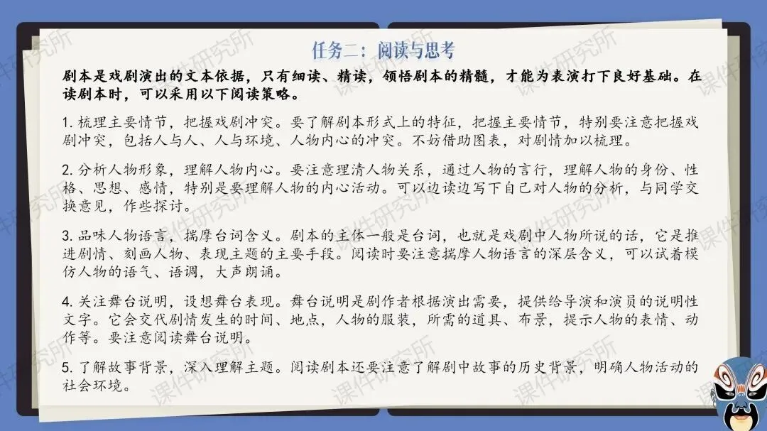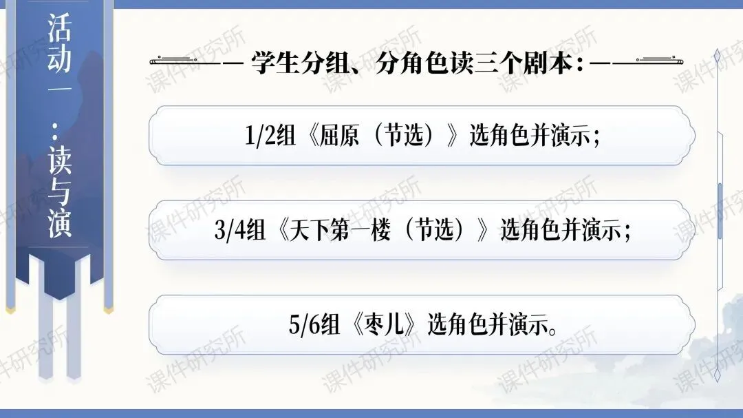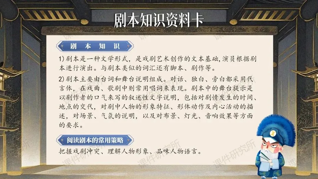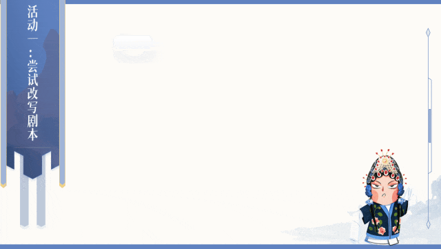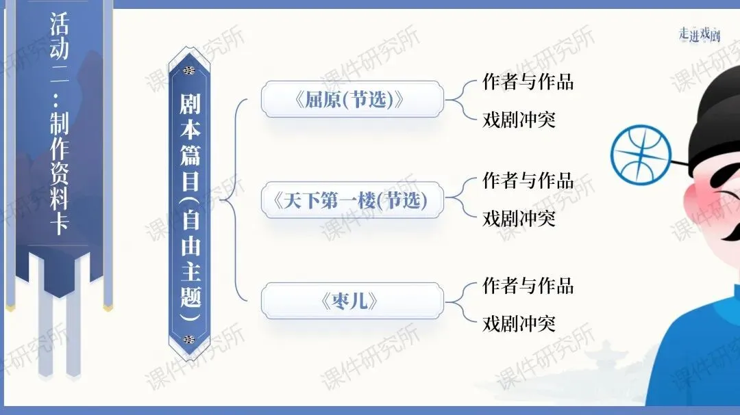 ✨✨本课件围绕“戏剧”展开了多种多样的课堂活动,比如:了解剧本知识、收集资料卡片、读与演、改写剧本、排练戏剧等。