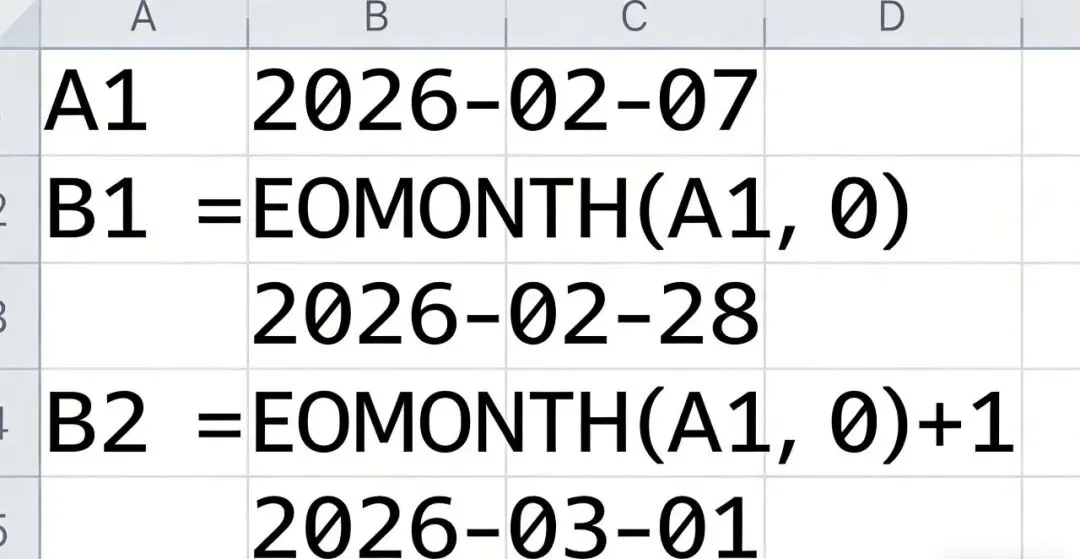 举个例子:如果A1单元格是“2026-02-07”,输入公式=EOMONTH(A1, 0),瞬间得出2026年2月最后一天(2026-02-28);输入=EOMONTH(A1, 0)+1,直接算出3月第一天(2026-03-01)。