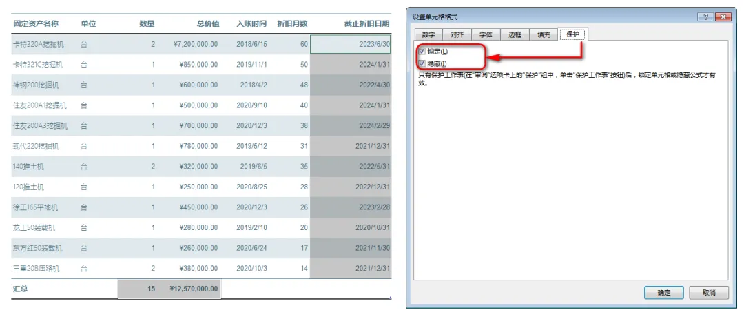 3、选中的有公式的单元格后,再次右键,点击弹出菜单中的“设置单元格格式”,在窗口中,将“锁定”和“隐藏”选项勾选上,然后确定。