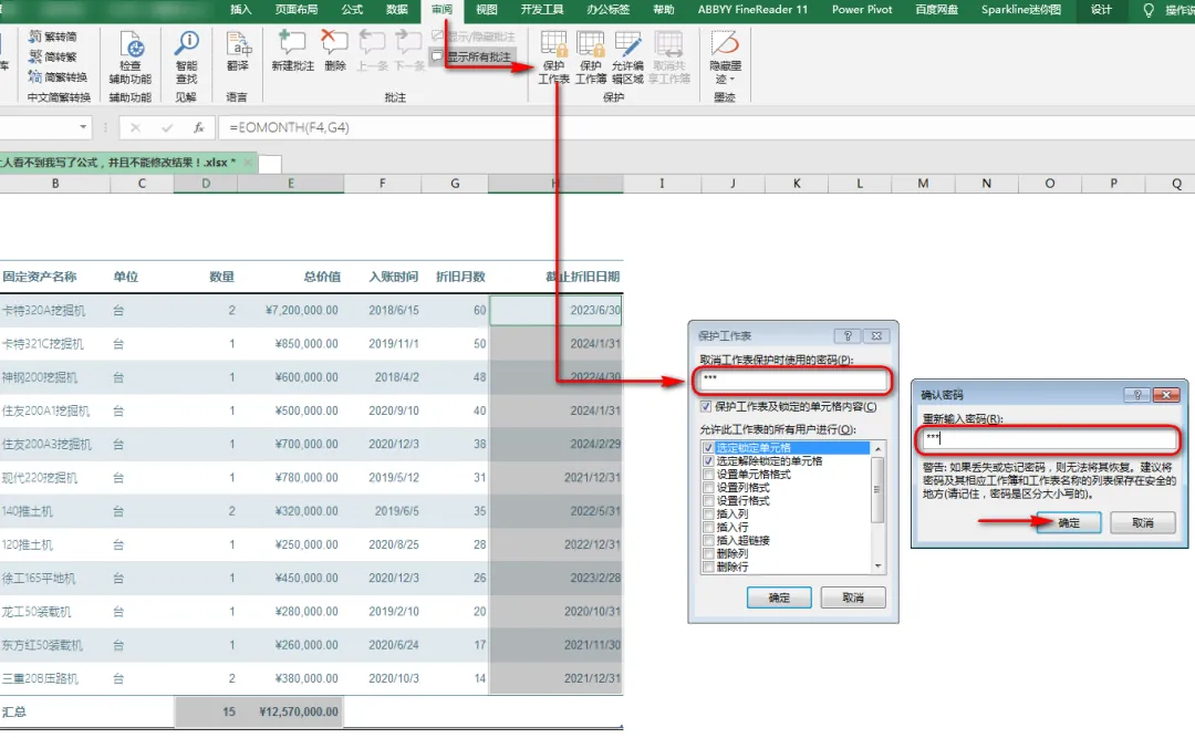 4、点击工具栏“审阅”中的“保护工作表”,输入两次同样的密码,就完成了工作表的保护。
