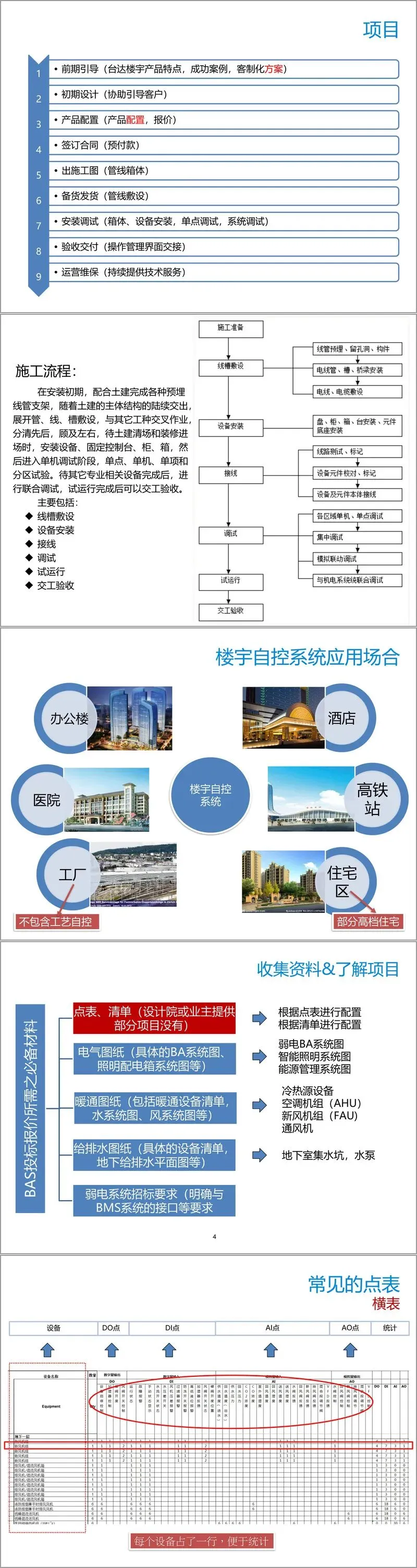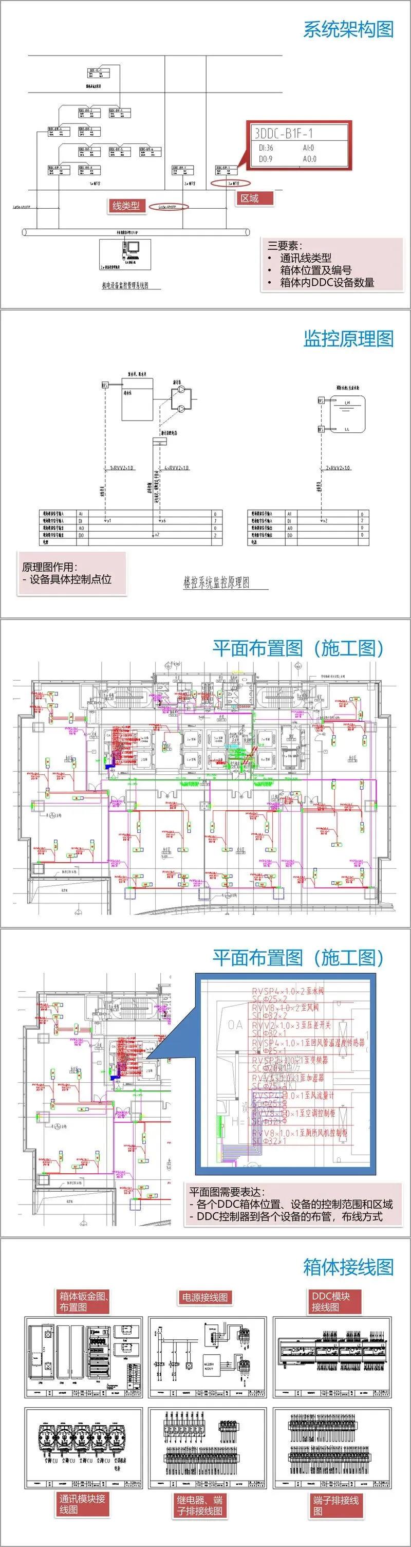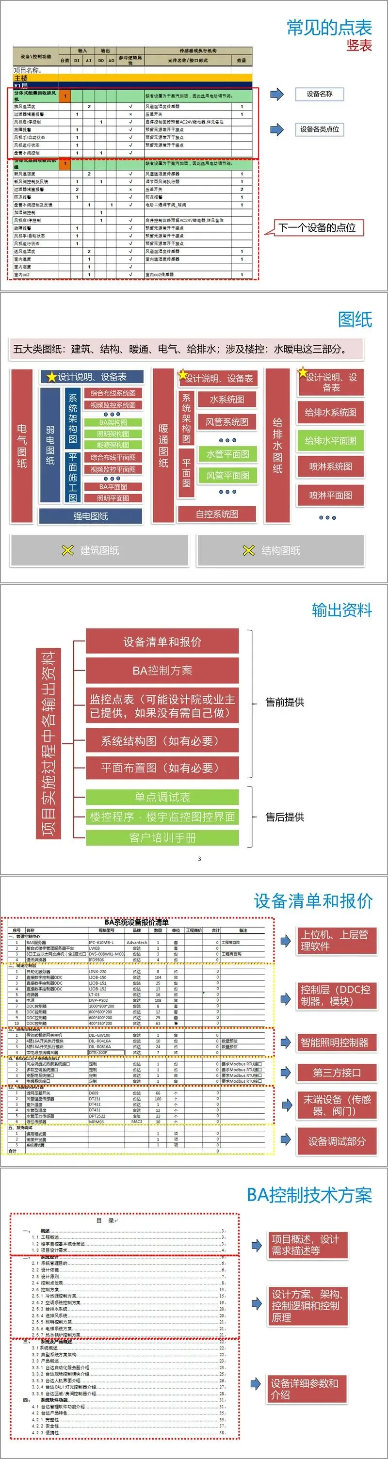 系统设计的核心是监控点的规划与配置,监控点分为模拟输入(AI)、开关输入(DI)、模拟输出(AO)、开关输出(DO)四类,分别对应不同的信号类型和控制需求。点表分为横表和竖表两种形式,需根据设备类型、控制功能、安装位置等信息详细统计,为设备配置提供依据。同时,设计需依托建筑、结构、暖通、电气、给排水五大类图纸,重点关注水暖电相关部分,确保系统与建筑本体的适配性。