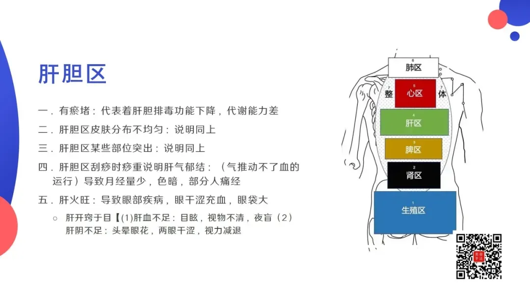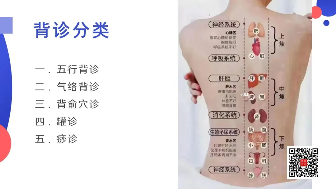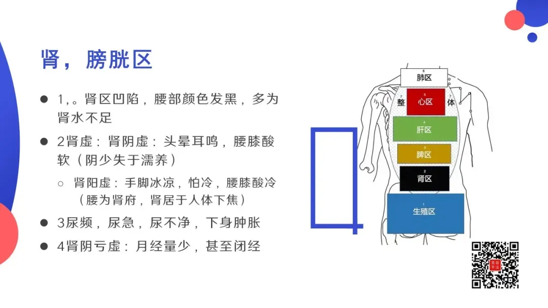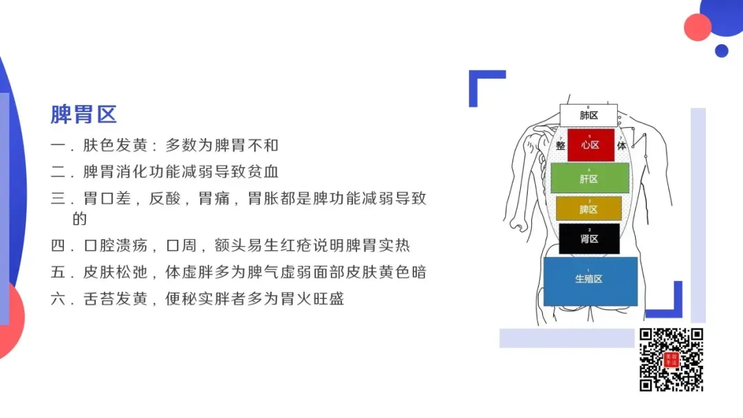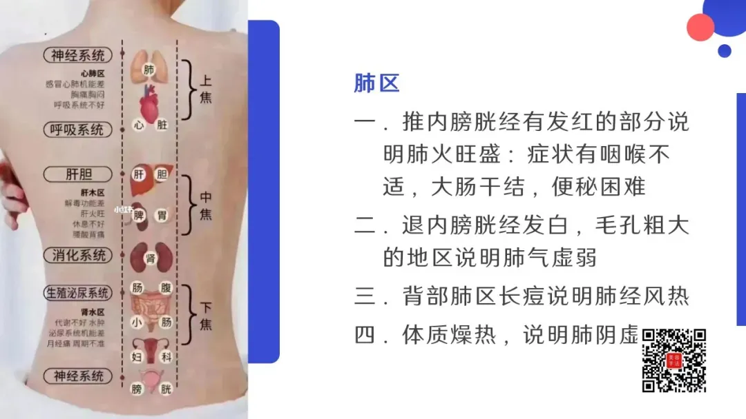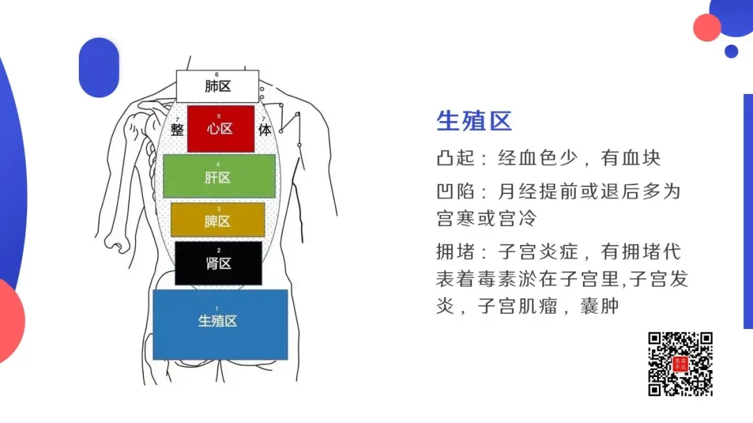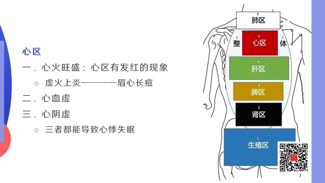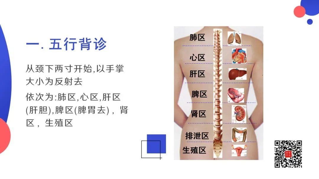 五行背诊:从颈下两寸开始,以手掌大小为反射去,依次为:肺区,心区,肝区(肝胆),脾区(脾胃去),肾区,生殖区