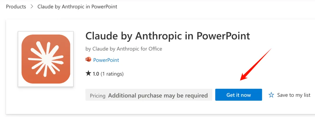 Claude PPT 的安装很简单,在微软的 Marketplace 搜索 Claude by Anthropic in PowerPoint,点击“立即获取”,登录你的微软账号,插件就自动下载安装。