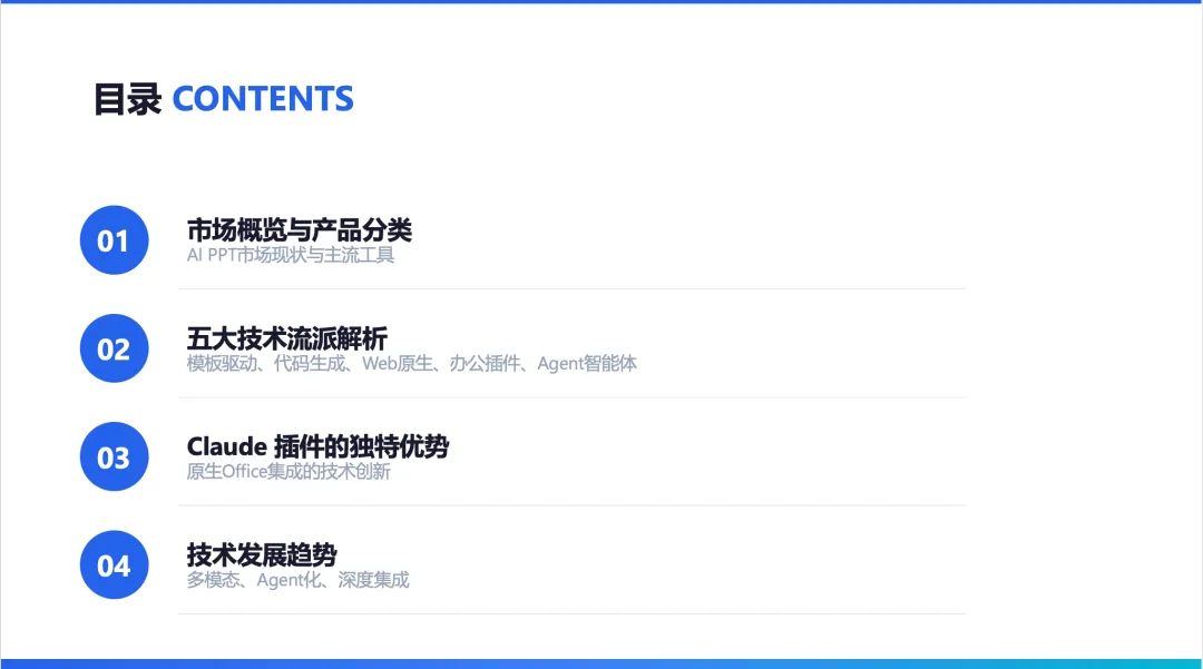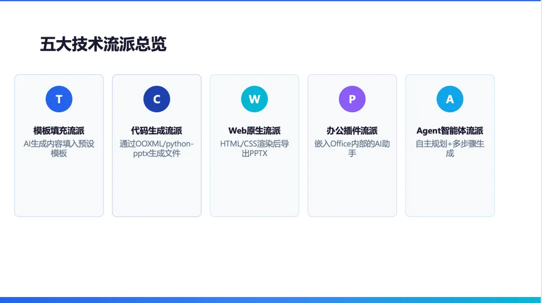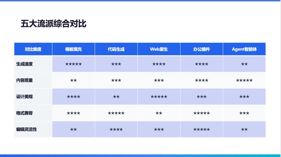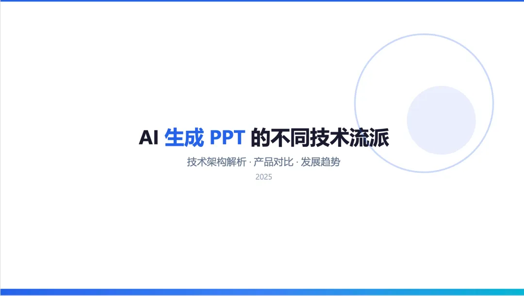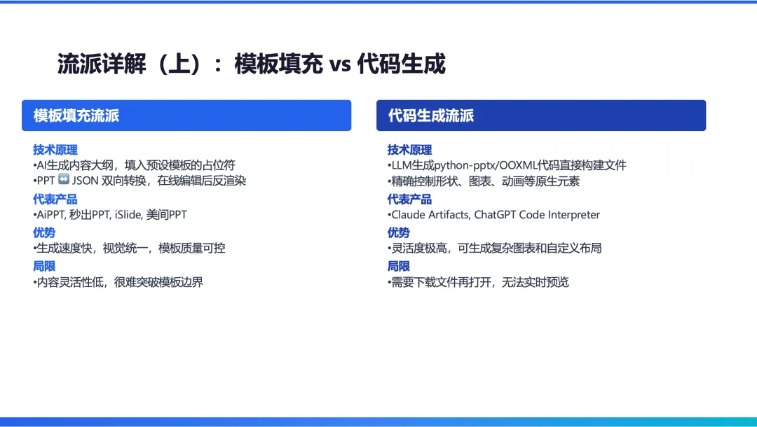 这是基于文档自动生成 PPT 。我接着又让它做了一个“自动调研+PPT 生成的工作”。这次调研的是AI PPT 生成的流派;我同时限定了 PPT 的背景为白色,主要色调为蓝色。