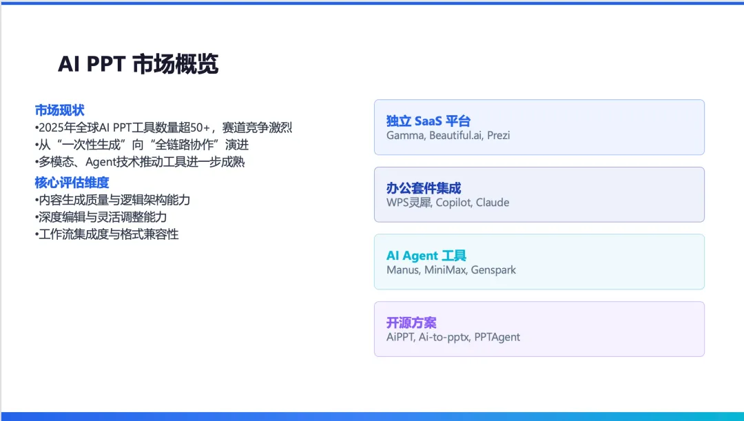 即 AIPPT 能否在原生 PowerPoint 里进入可编辑、可迭代的闭环。这意味着 AI PPT 的主战场,正在迁移到“编辑器 + 代理式工作流”。