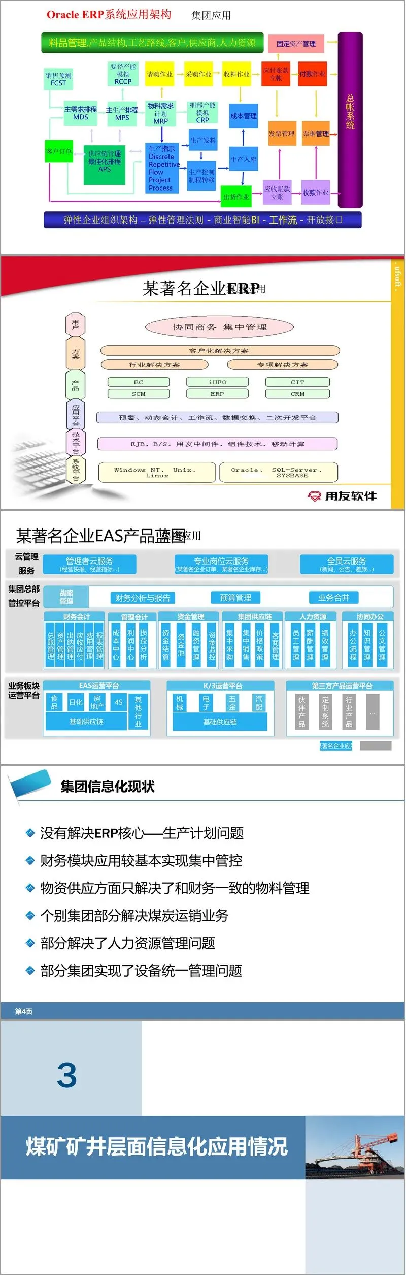 在煤矿管理信息系统方面,目前多数企业已部署各类信息平台,但整体仍存在系统集成度低、协同性差等问题。集团级信息系统往往未能有效延伸至基层班组,导致管理断层。例如,ERP系统在财务模块实现集中管控,但在生产计划、成本控制等核心环节功能薄弱,物资管理仅局限于与财务一致的物料管理,未能形成全流程闭环。部分企业虽在人力资源、设备管理等方面取得进展,但整体信息化水平仍处于“重监控、轻管理”的阶段。