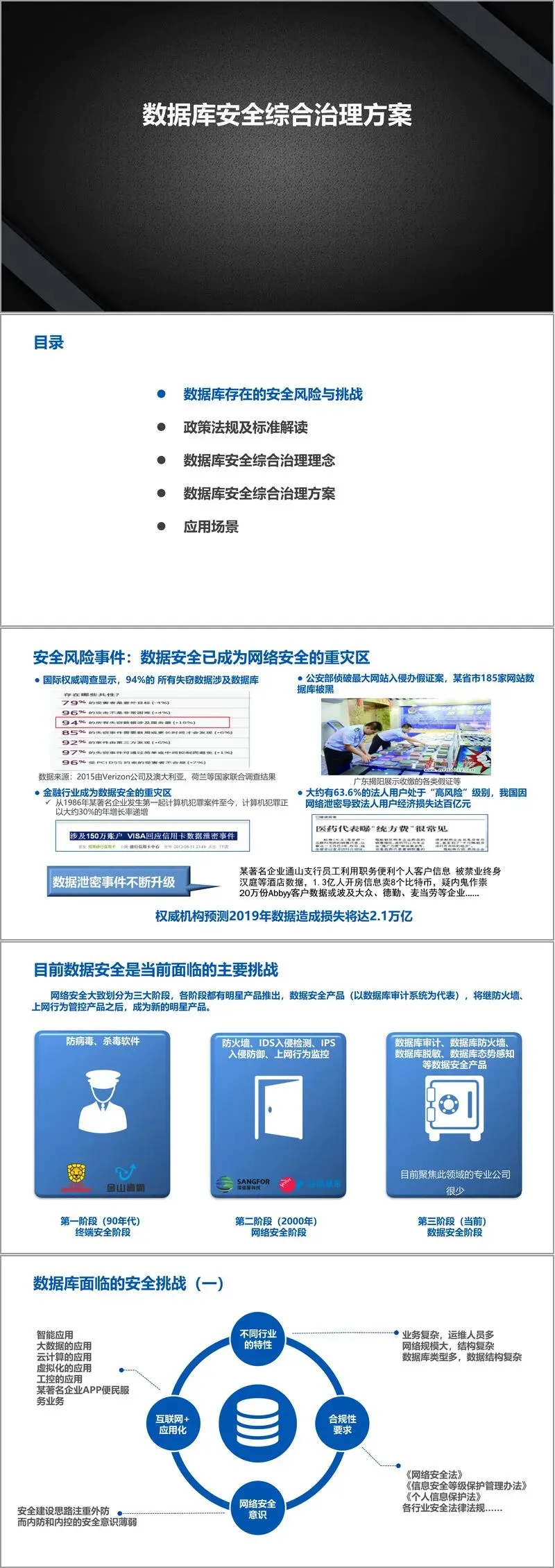 在风险与挑战部分,文件指出,数据安全已成为网络安全的“重灾区”。据统计,94%的失窃数据涉及数据库,金融、政务、医疗等行业尤为严重。数据泄露事件频发,如酒店开房信息被贩卖、企业客户数据外泄等,凸显出数据库作为核心资产所面临的系统性威胁。随着智能应用、云计算、大数据、虚拟化等技术的普及,数据库环境日趋复杂,内外风险交织,传统以边界防护为主的安全体系已难以应对。