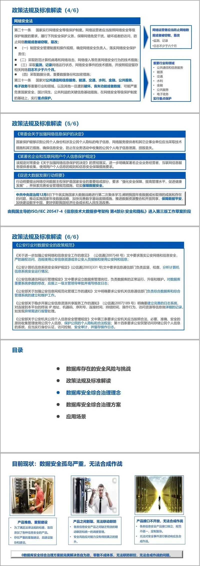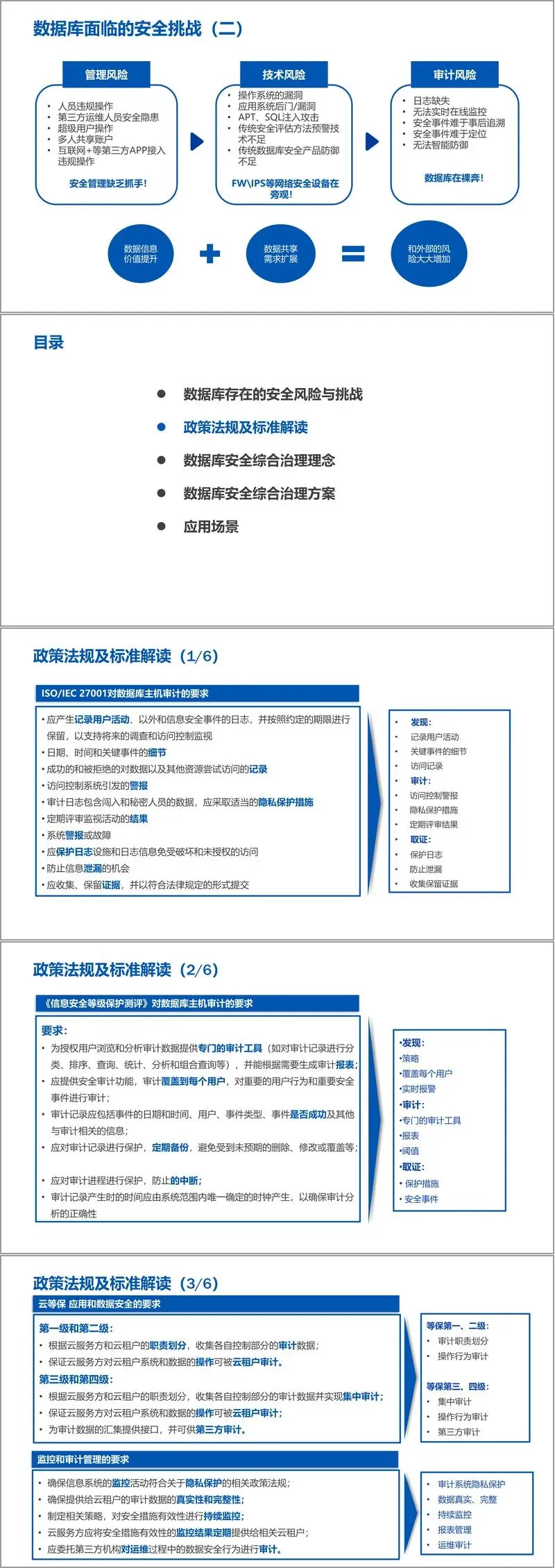 政策法规方面,文件梳理了多项国内外标准与法律要求。ISO/IEC 27001、等级保护测评、网络安全法等均对数据库审计提出明确要求,包括日志完整性、访问行为记录、隐私保护、审计工具专业化、日志保留不少于六个月等。特别是在云环境中,等保三级以上要求实现集中审计与第三方审计能力。公安、金融、公共服务等重点行业还需遵循行业特定规范,如公安部多项规定强调操作日志留存、身份认证与访问控制。