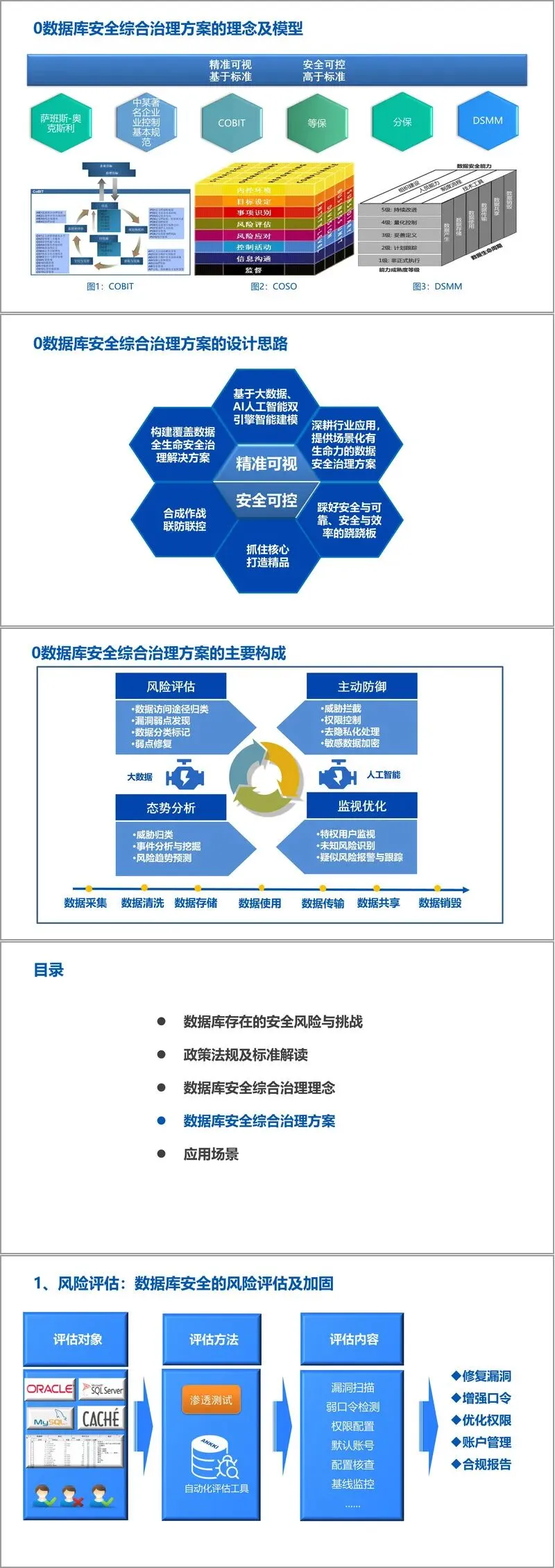 针对当前安全建设存在的“产品堆叠、各自为政、无法联动”等问题,文件提出了“数据库安全综合治理”理念。该理念强调打破安全孤岛,实现产品间的联动与合成作战,构建“精准可视、安全可控”的防护体系。其设计思路涵盖从风险评估、主动防御、实时监控到态势感知的全生命周期管理,形成闭环治理模式。