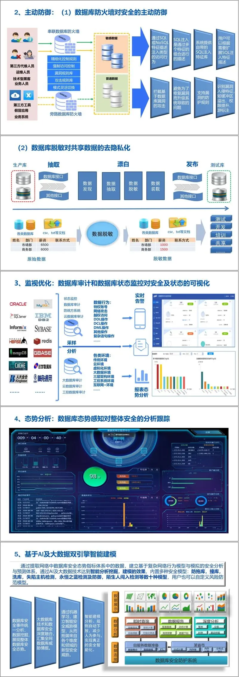 技术方案部分详细介绍了七大核心模块。第一是风险评估与加固,包括漏洞修复、权限优化、账户管理等;第二是主动防御,通过数据库防火墙实现访问控制与危险操作阻断,结合数据库脱敏系统对敏感数据进行去标识化处理;第三是监视优化,借助数据库审计与状态监控系统,实现行为可视化与实时告警;第四是态势分析,通过AI与大数据技术构建智能模型,检测拖库、撞库、APT攻击等复杂威胁;第五是开放性设计,提供标准接口实现多产品互联;第六是合成作战平台,联动网络、终端、应用等多层防护体系;第七是国产化支持,推出基于国产芯片的自主可控产品。