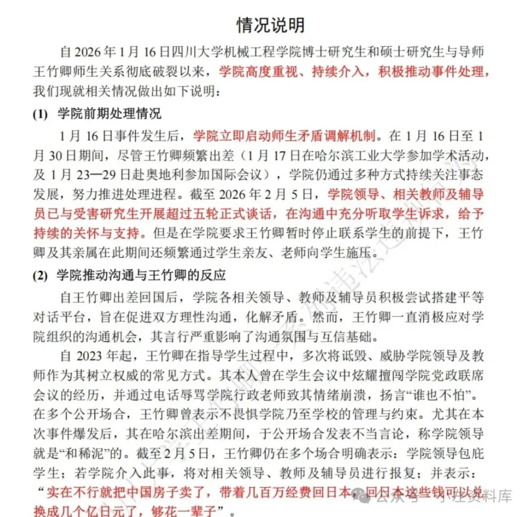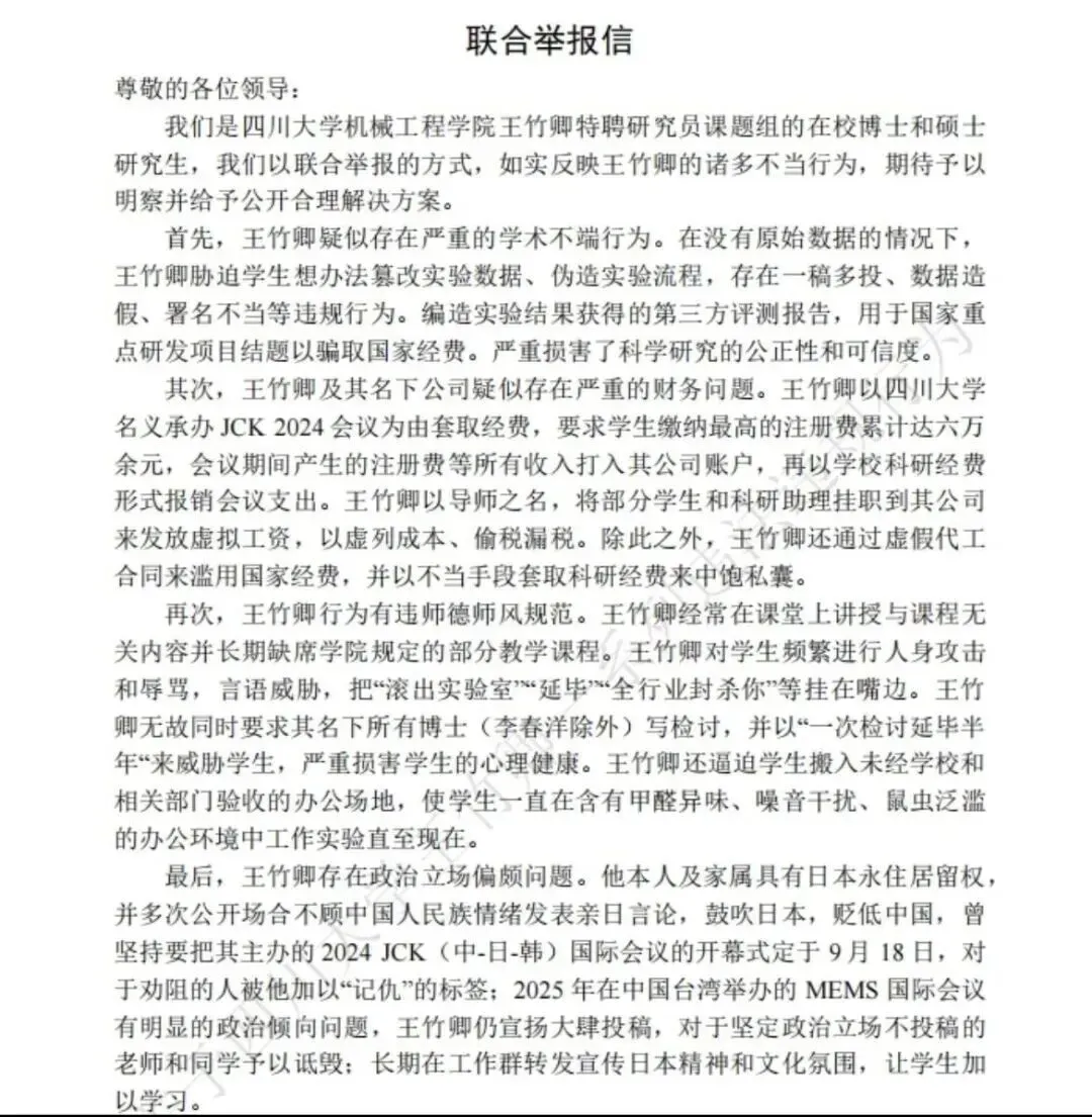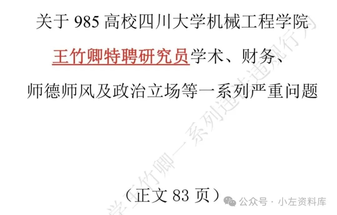 近期引发社会高度关注的高校师生冲突事件。简单来说,就是四川大学机械工程学院的多名在读硕博研究生,因为长期忍受不了导师王竹卿的压榨和违规行为,最终联手制作了一份长达83页的PDF举报材料,实名揭露其多项严重问题。