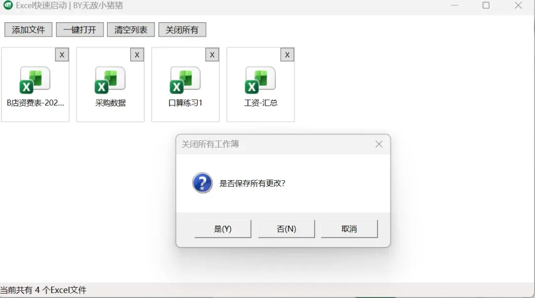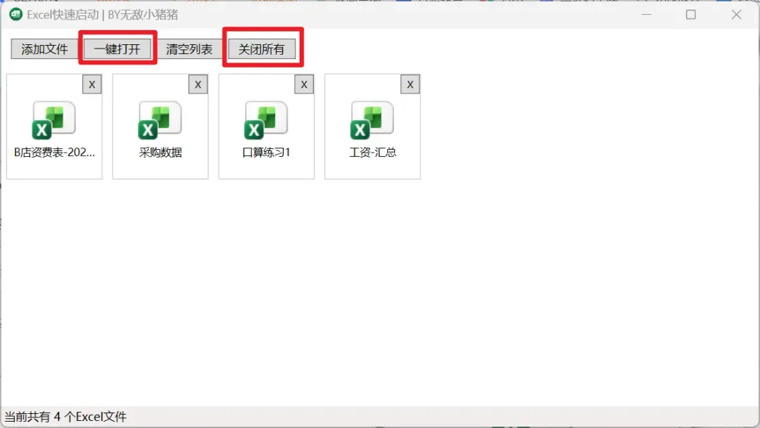 它的核心功能特别专一,就是快速开启、一键关闭多个 Excel 表格,操作简单到零门槛,小白也能秒上手:日常工作中,只要把需要打开的 Excel 表格,直接拖入这款软件的界面,点击【一键打开】,不管是 2 个还是 4 个表格,都能实现秒开!