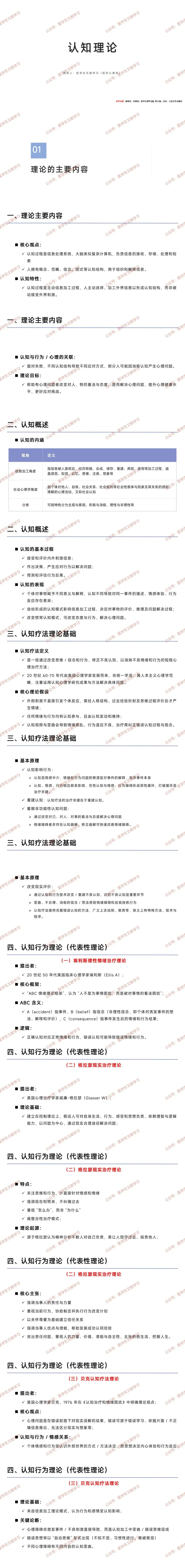 认知与情感、行为的关系:个体的情感体验和行为反应,由 “认识外部世界的方式” 决定,即 “思想决定内心感受与行动”;心理障碍的关键是认知加工中的歪曲思维,且不同障碍有特定认知歪曲(如抑郁症常伴 “自我否定”,焦虑症常伴 “灾难化思维”)。