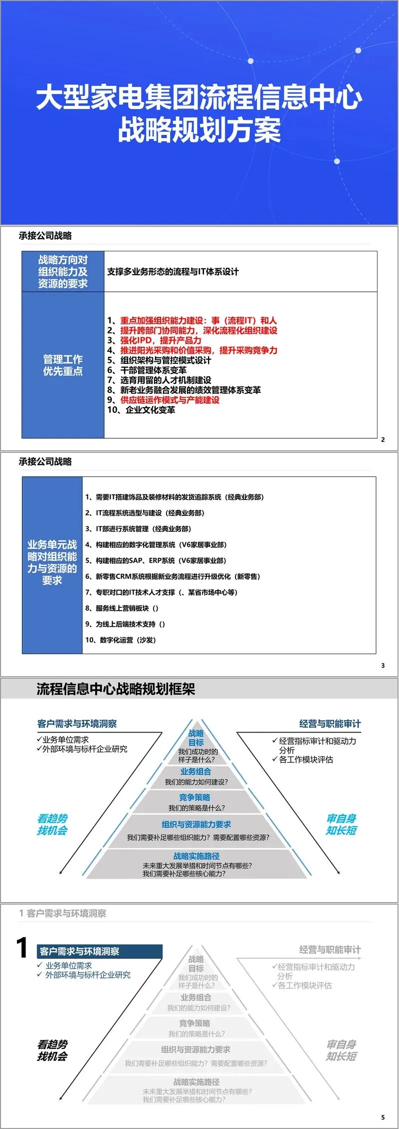 本战略规划方案围绕一家大型家电集团流程信息中心的战略定位、现状诊断、目标设定及实施路径展开,系统性地呈现了该中心如何承接公司战略、推动数字化转型、优化业务流程并构建数字化能力体系。