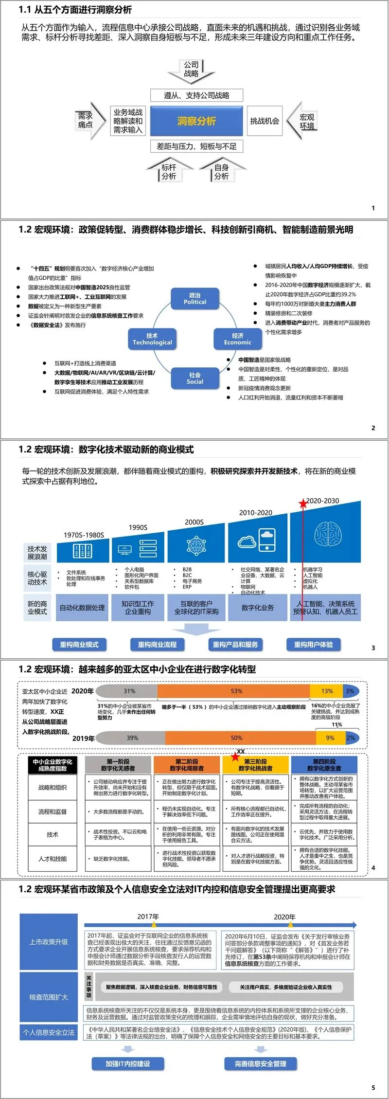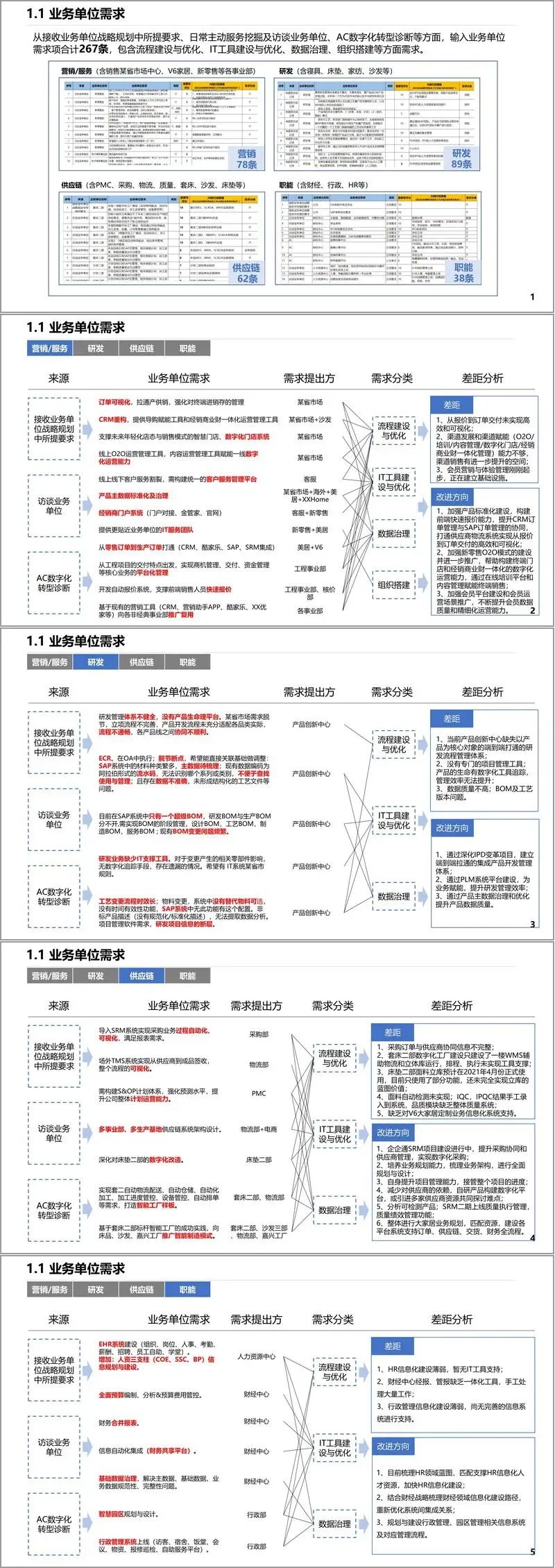 规划首先从客户需求与环境洞察入手,通过分析宏观环境、行业趋势、业务单位需求及外部标杆,识别出数字化转型的迫切性与方向。宏观层面,政策推动智能制造、数字经济规模持续扩大,消费群体结构变化与个性化需求增长,技术如大数据、物联网、人工智能等正重构商业模式。业务层面,各事业部提出共267项需求,涵盖流程优化、IT工具建设、数据治理与组织搭建,重点聚焦订单可视化、CRM重构、数字化门店、研发平台、供应链协同等领域。