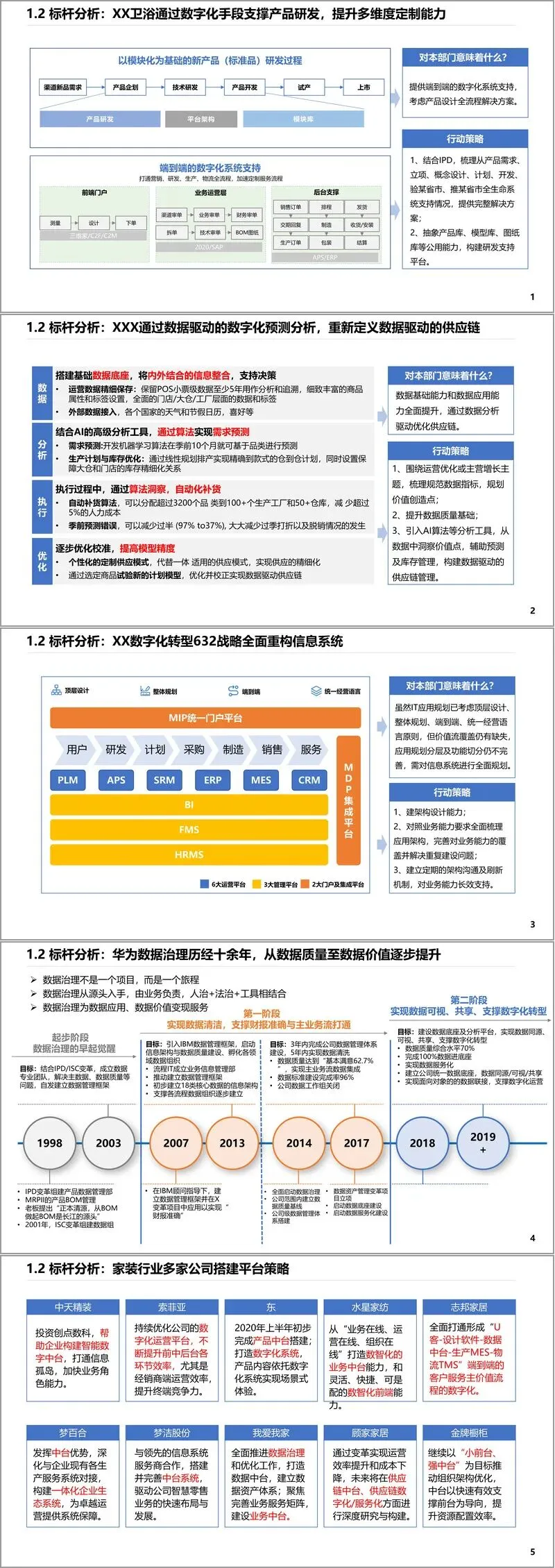 在业务组合与竞争策略中,规划提出“双态IT”策略,兼顾稳态与敏态业务,聚焦营销数字化、研发数字化、供应链数字化三大主线,并围绕平台化、数据驱动、智能化制造等方向构建核心能力。战略举措包括八大方向:构建IPD研发体系、推进智能制造、建设S&OP计划体系、打造会员生态、实施数据治理、推动IT中台战略、优化采购体系、强化流程内控。