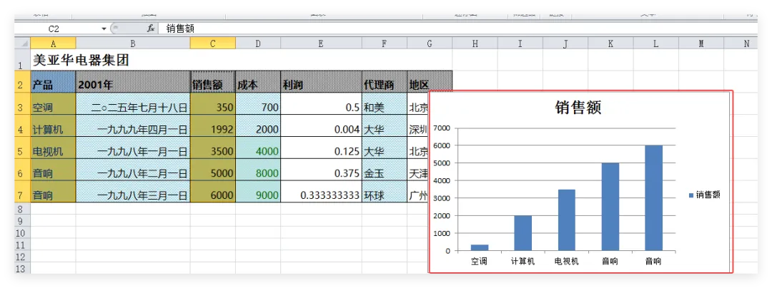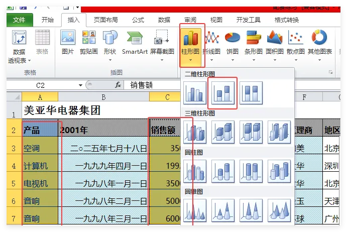 2、利用已有表格数据制作图表(这里我们选择“产品”和“销售额”这两列数据)