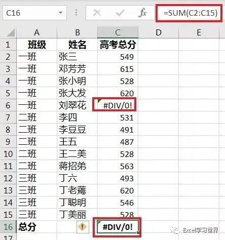 先看一下用普通的 sum 函数求和,因为错误值的存在,无法求和: