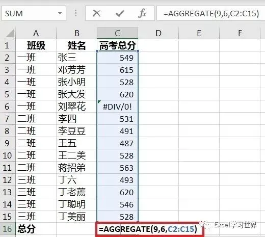 =AGGREGATE(9,6,C2:C15)
