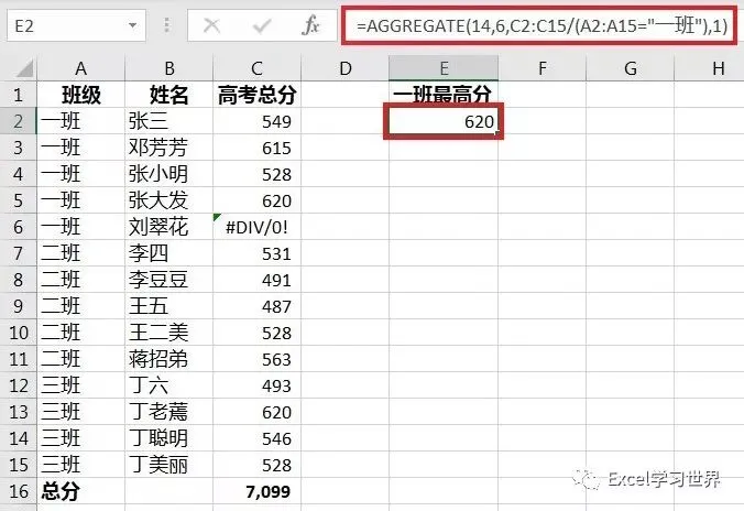 =AGGREGATE(14,6,C2:C15/(A2:A15="一班"),1)