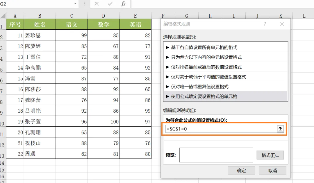 =$G$1=0,公式含义为G1单元格为空单元格时条件成立,表格按设置格式;