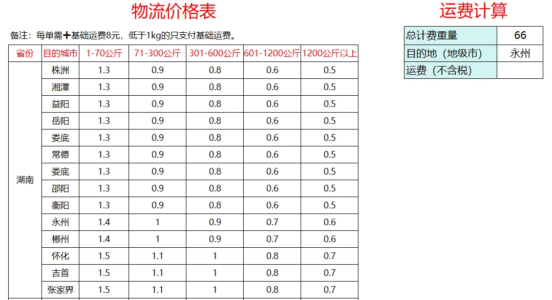 xcel计算快递费。