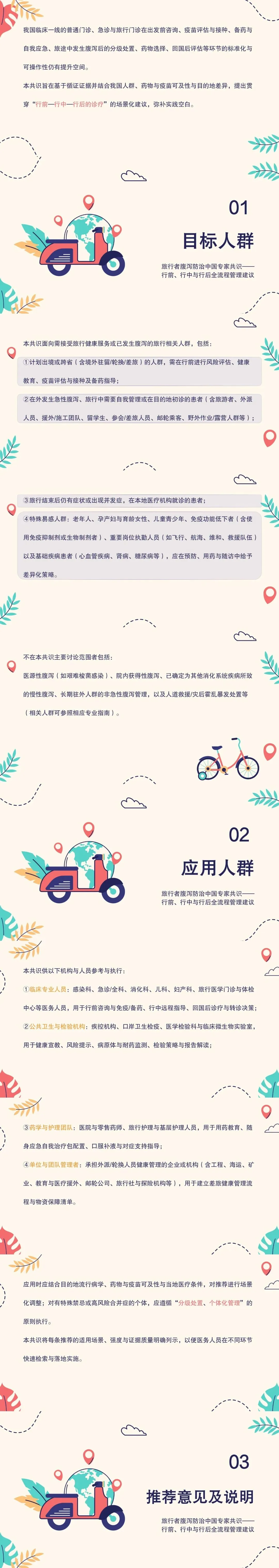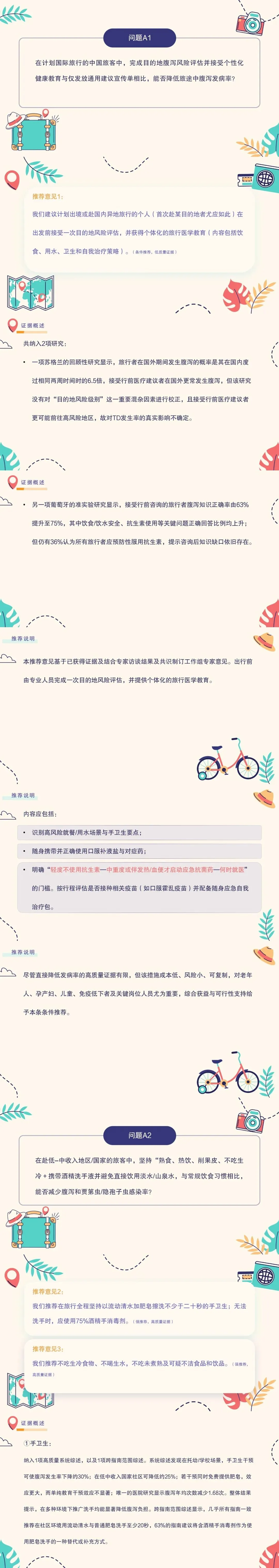 1.我们建议计划出境或赴国内异地旅行的个人(首次赴某目的地者尤应如此)在出发前接受一次目的地风险评估,并获得个体化的旅行医学教育(内容包括饮食、用水、卫生和自我治疗策略)。