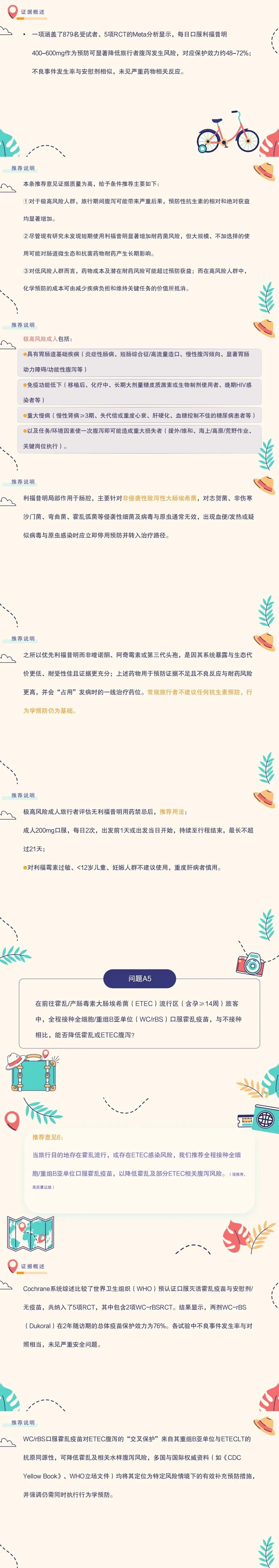 6.当旅行目的地存在霍乱流行,或存在ETEC感染风险,我们推荐全程接种全细胞/重组B亚单位口服霍乱疫苗,以降低霍乱及部分ETEC相关腹泻风险。