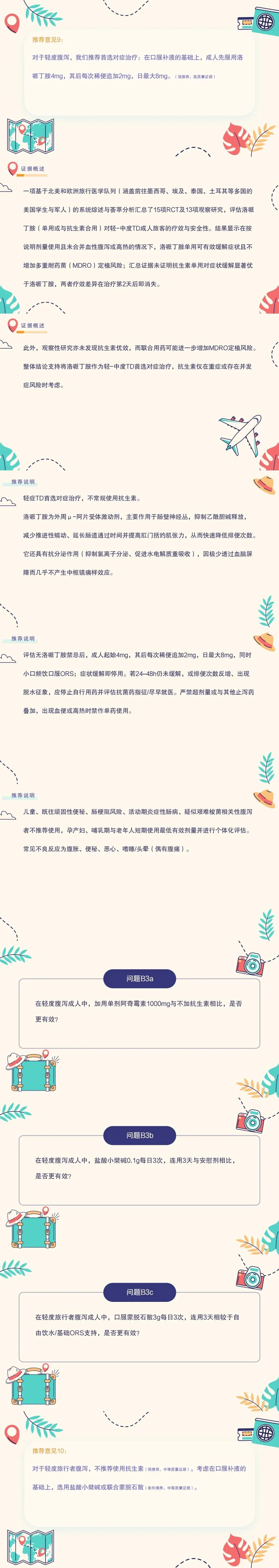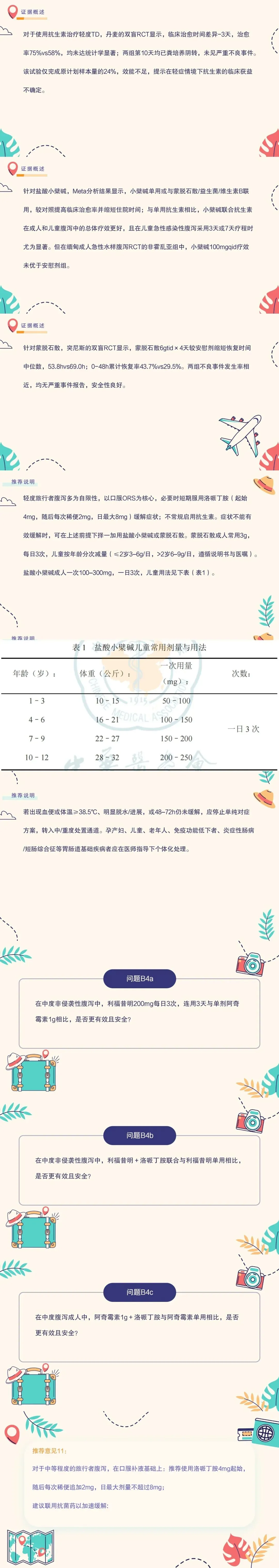 10.对于轻度旅行者腹泻,不推荐使用抗生素。考虑在口服补液的基础上,选用盐酸小檗碱或联合蒙脱石散。