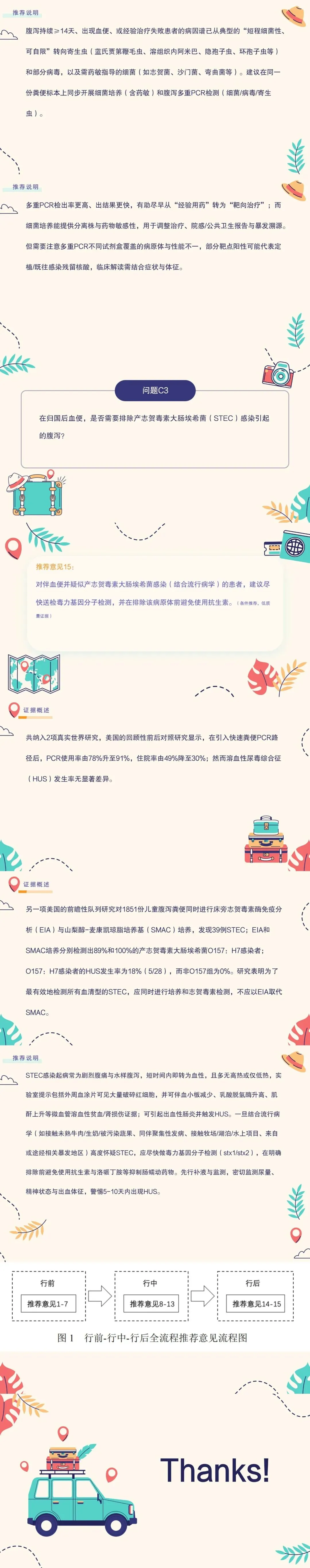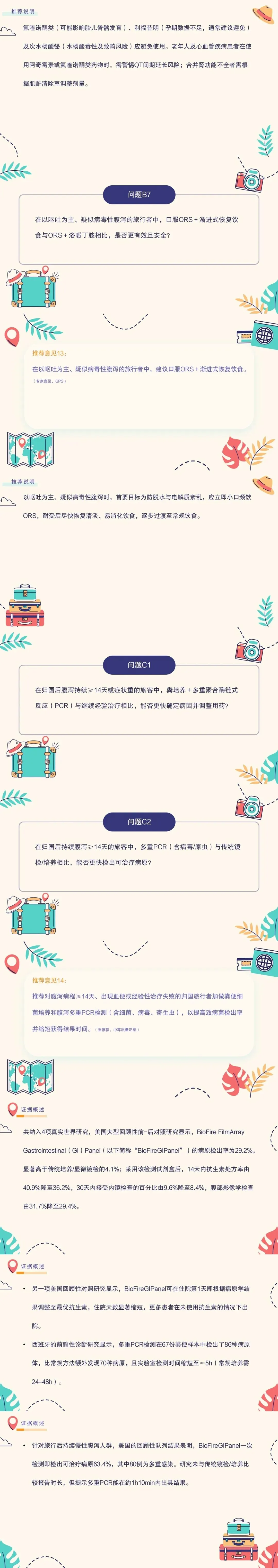 14.推荐对腹泻病程≥14天、出现血便或经验性治疗失败的归国旅行者加做粪便细菌培养和腹泻多重PCR检测(含细菌、病毒、寄生虫),以提高致病菌检出率并缩短获得结果时间。