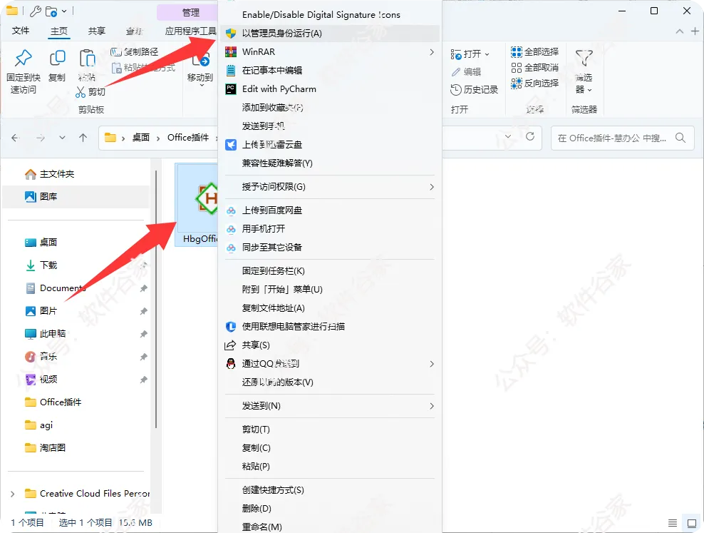 关闭所有 Office/WPS 窗口→右键“HuiOfficeSetup.exe”→“以管理员身份运行”。
