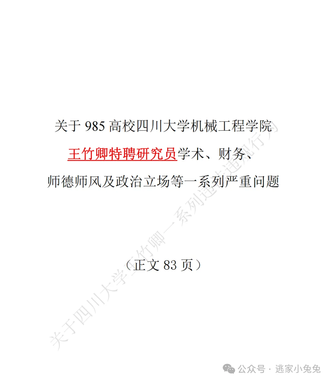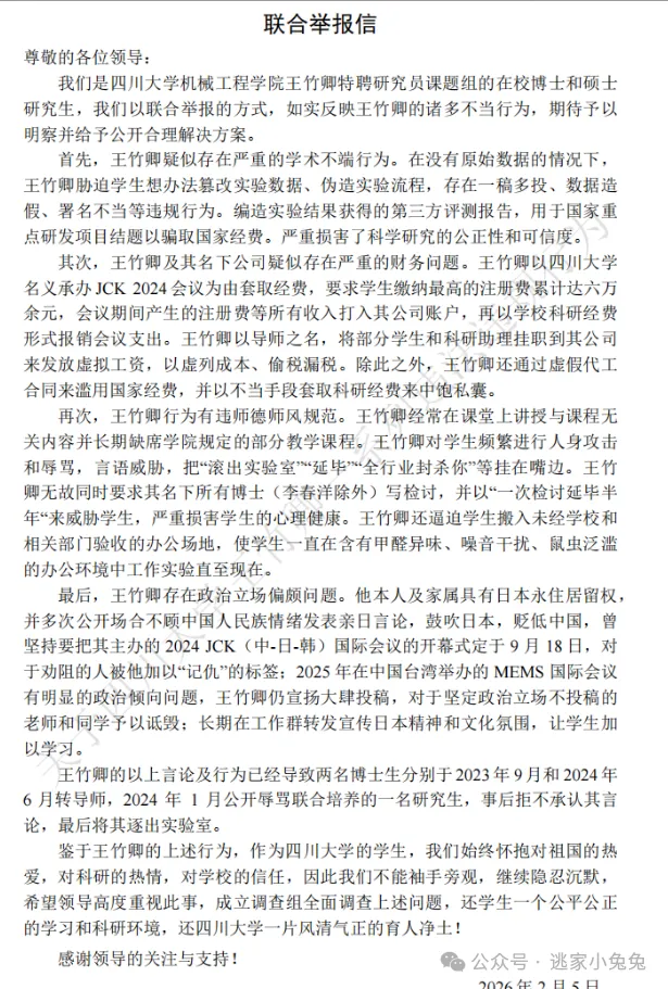2026年2月5日,四川大学某课题组多名在读硕博研究生联名举报导师王竹卿,指控其存在学术不端、侵占经费、师德失范等问题,并提交了长达83页的PDF材料作为证据。校方于次日(2月6日)发布通报称已成立工作专班启动调查,若查实将严肃处理。