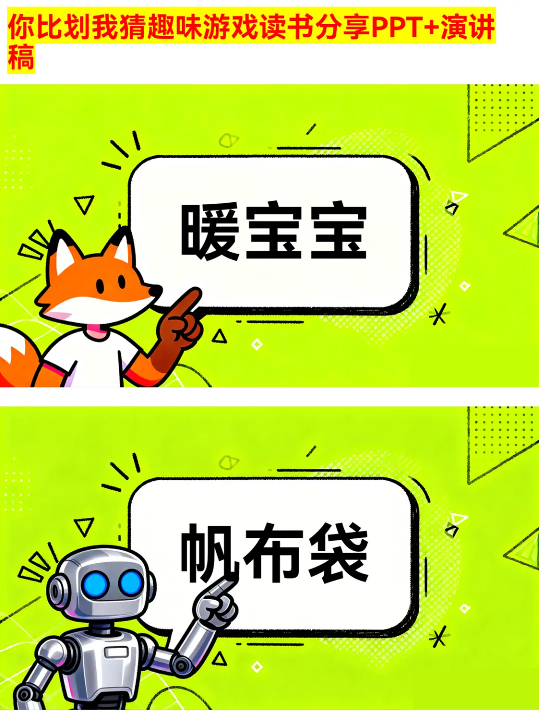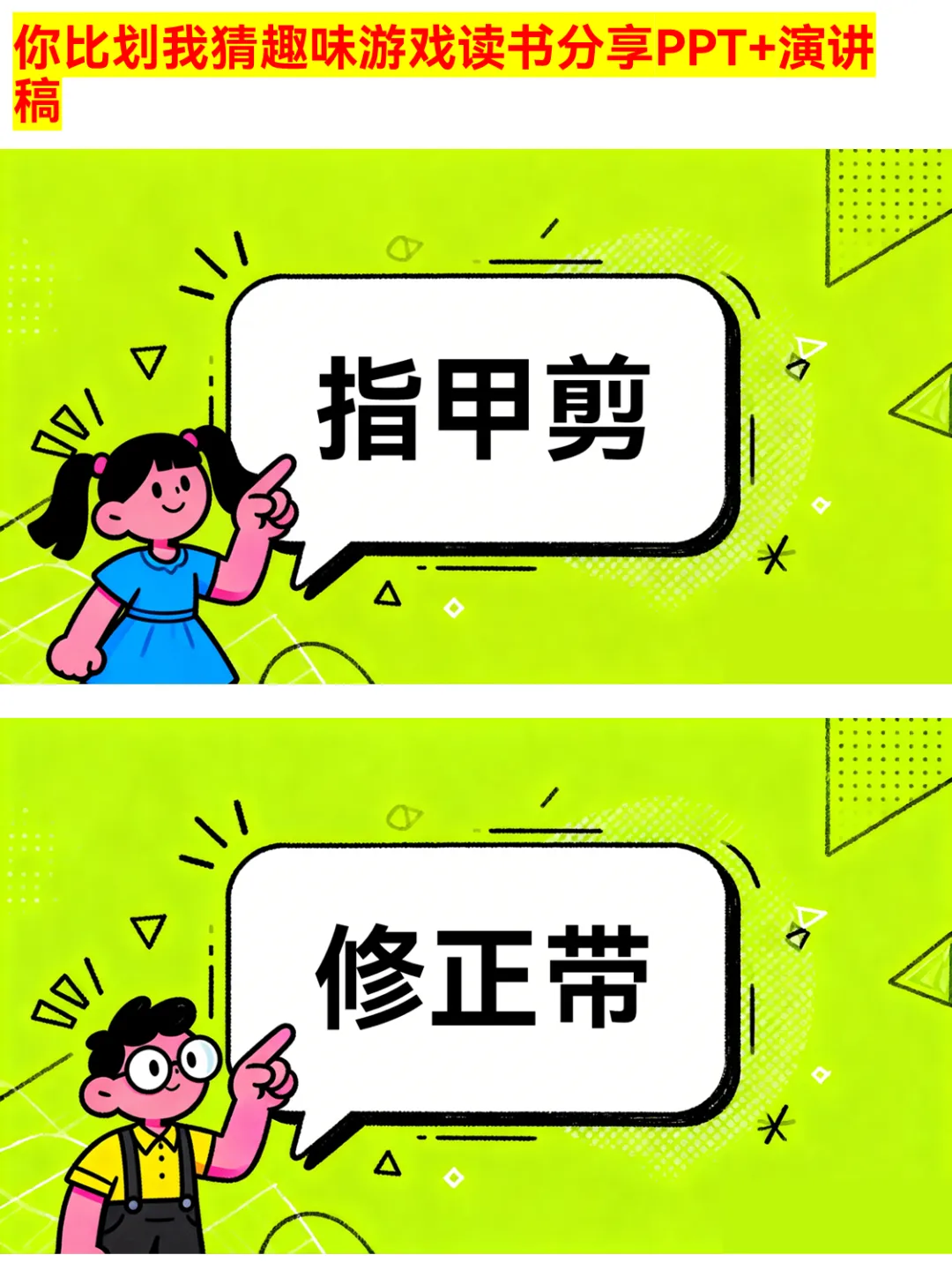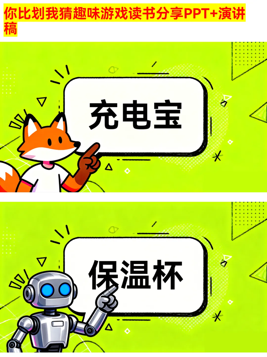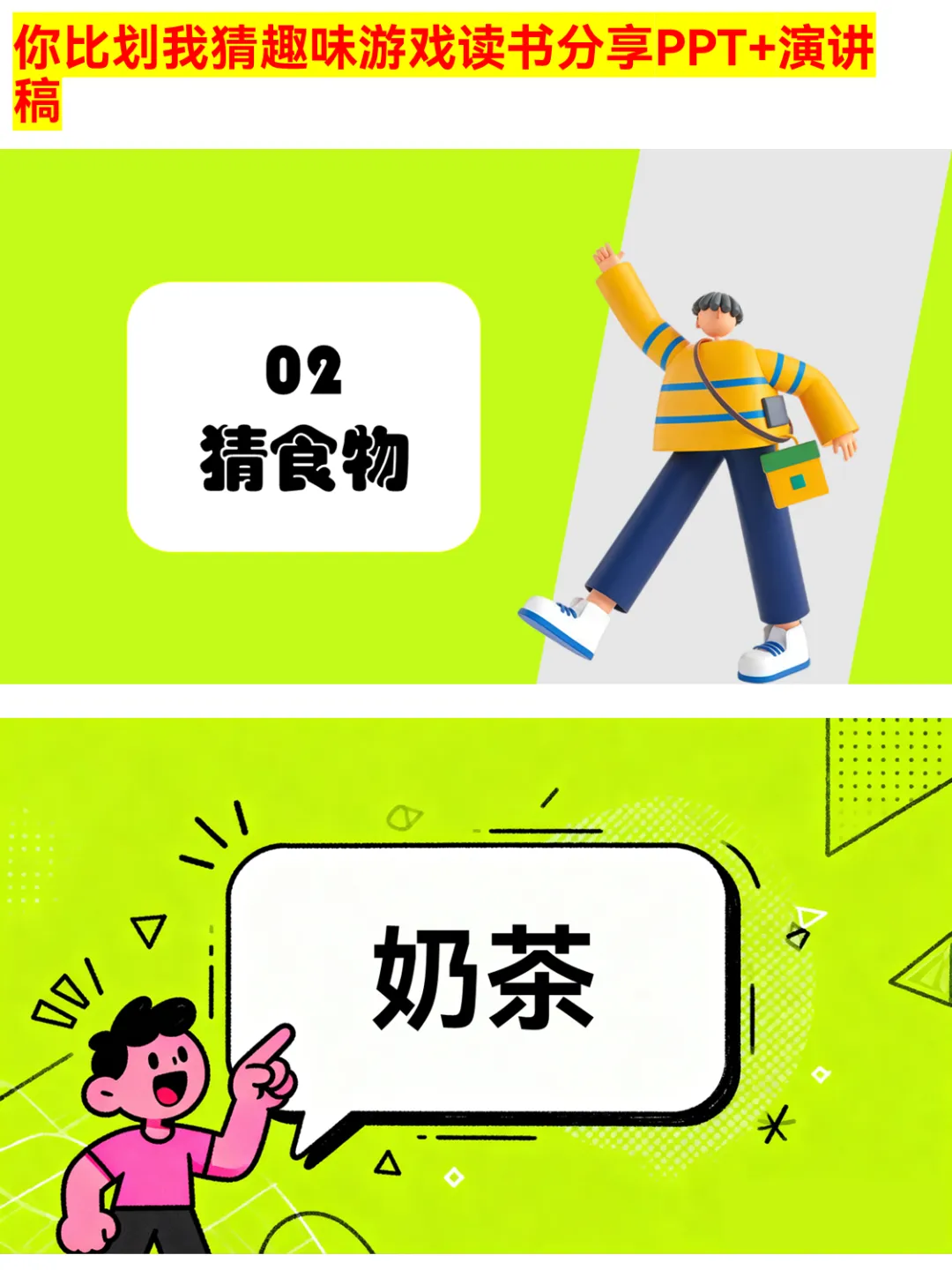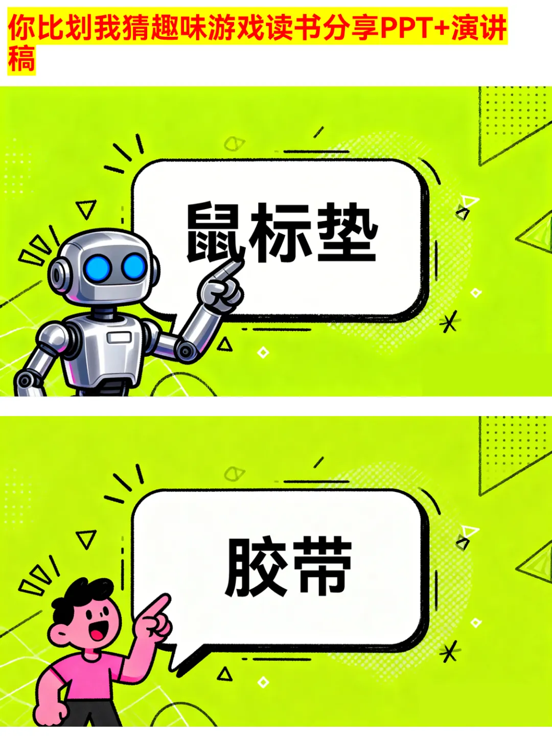 朋友聚会、公司团建还在愁玩什么?这款你比划我猜PPT绝对是气氛组top1!有猜物品、猜食物、猜成语、猜职业、猜运动5大类别,30个趣味词汇,涵盖奶茶、火锅、画蛇添足、医生、篮球等超贴近生活的内容~ 游戏规则简单,支持2人配合或小组集体参与,限时5分钟,PASS次数有限制,竞技感拉满!不管是同学聚会、部门团建还是家庭派对,用它都能快速暖场,让大家玩得超尽兴~ 关键词:你比划我猜、聚会游戏、团建游戏、趣味游戏PPT、派对游戏 #你比划我猜 #聚会游戏 #团建游戏 #趣味游戏PPT #派对游戏 #互动游戏 #集体游戏 #暖场游戏 #游戏PPT #娱乐游戏