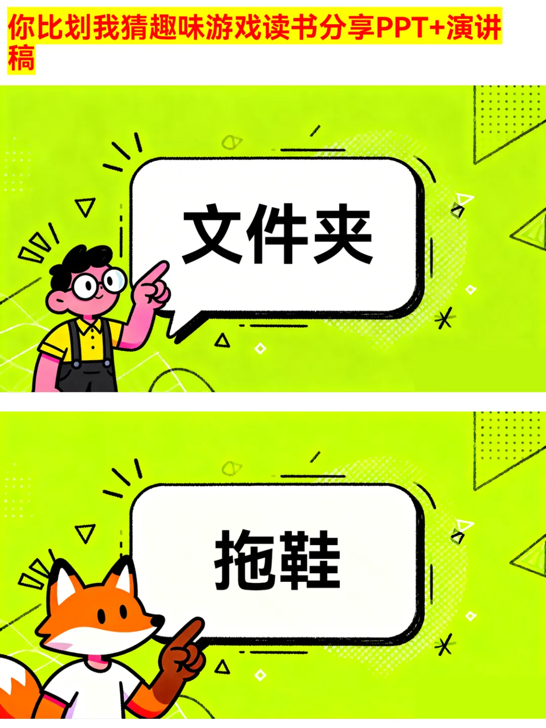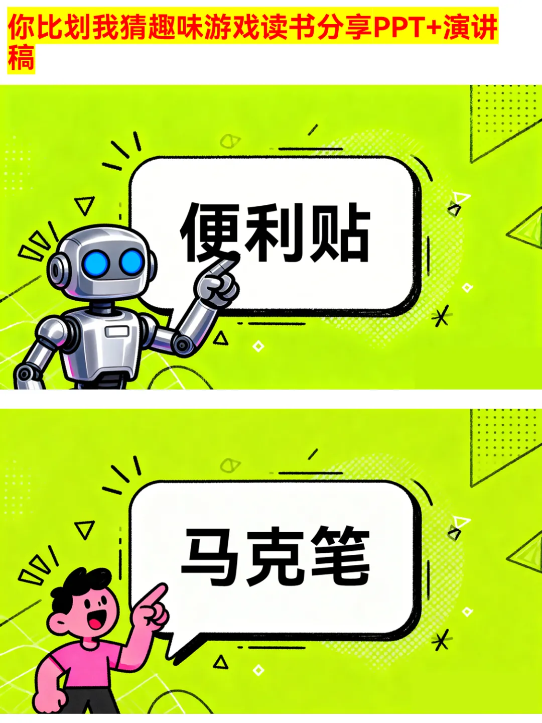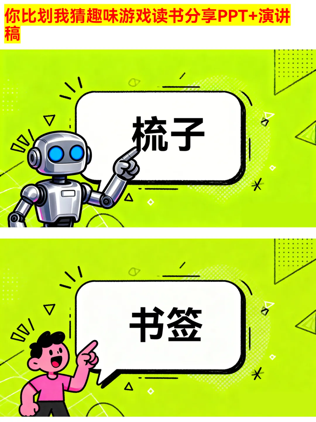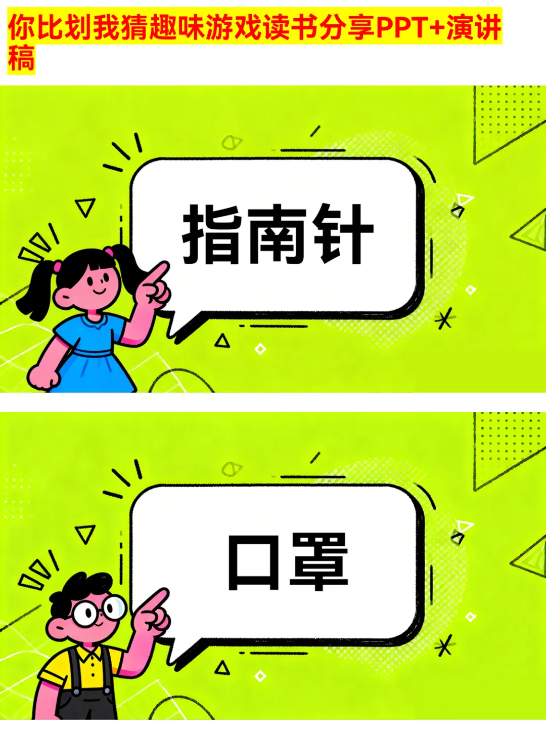 朋友聚会、公司团建还在愁玩什么?这款你比划我猜PPT绝对是气氛组top1!有猜物品、猜食物、猜成语、猜职业、猜运动5大类别,30个趣味词汇,涵盖奶茶、火锅、画蛇添足、医生、篮球等超贴近生活的内容~ 游戏规则简单,支持2人配合或小组集体参与,限时5分钟,PASS次数有限制,竞技感拉满!不管是同学聚会、部门团建还是家庭派对,用它都能快速暖场,让大家玩得超尽兴~ 关键词:你比划我猜、聚会游戏、团建游戏、趣味游戏PPT、派对游戏 #你比划我猜 #聚会游戏 #团建游戏 #趣味游戏PPT #派对游戏 #互动游戏 #集体游戏 #暖场游戏 #游戏PPT #娱乐游戏