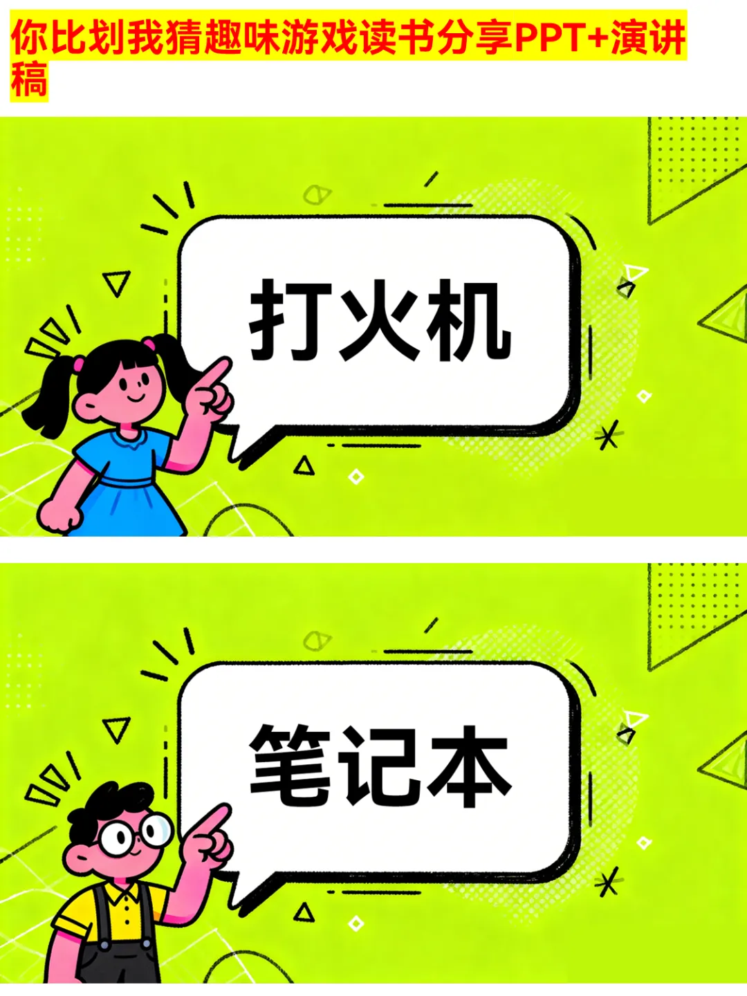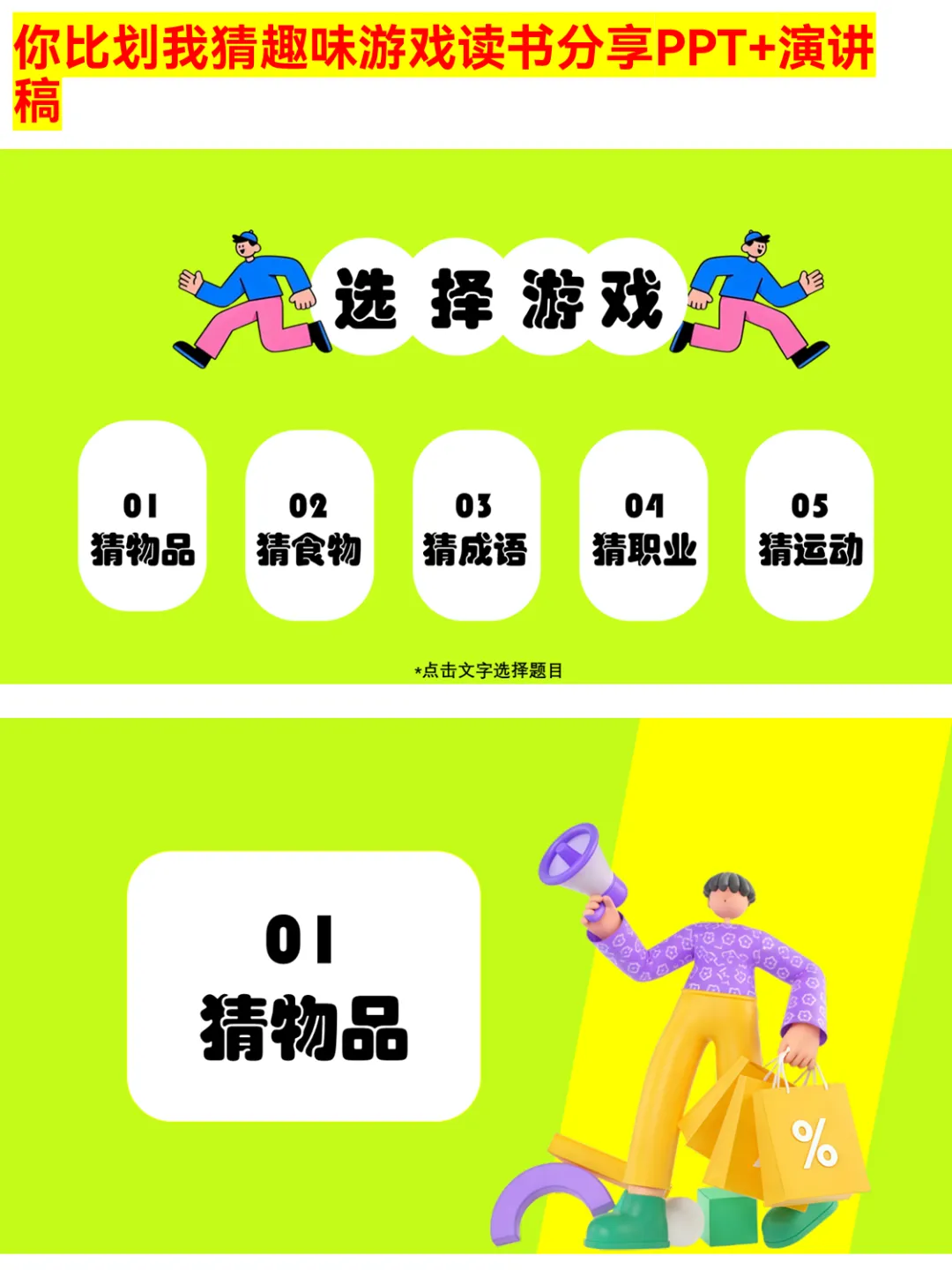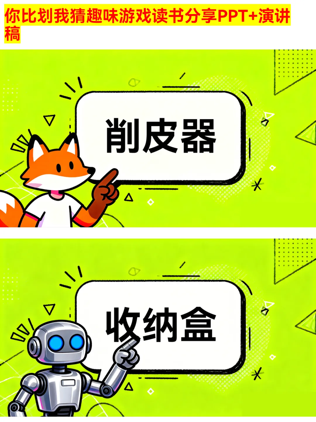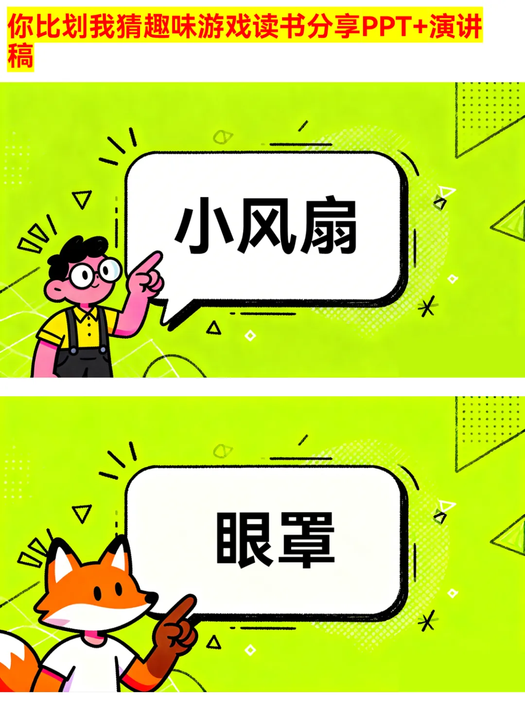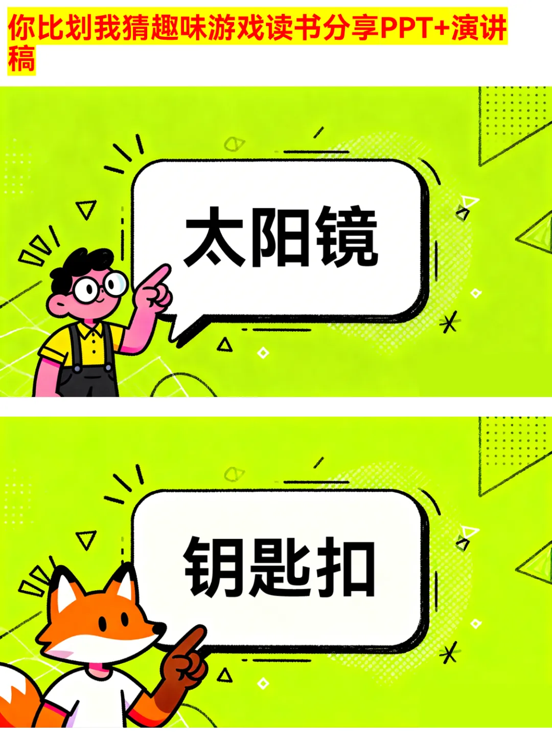 朋友聚会、公司团建还在愁玩什么?这款你比划我猜PPT绝对是气氛组top1!有猜物品、猜食物、猜成语、猜职业、猜运动5大类别,30个趣味词汇,涵盖奶茶、火锅、画蛇添足、医生、篮球等超贴近生活的内容~ 游戏规则简单,支持2人配合或小组集体参与,限时5分钟,PASS次数有限制,竞技感拉满!不管是同学聚会、部门团建还是家庭派对,用它都能快速暖场,让大家玩得超尽兴~ 关键词:你比划我猜、聚会游戏、团建游戏、趣味游戏PPT、派对游戏 #你比划我猜 #聚会游戏 #团建游戏 #趣味游戏PPT #派对游戏 #互动游戏 #集体游戏 #暖场游戏 #游戏PPT #娱乐游戏
