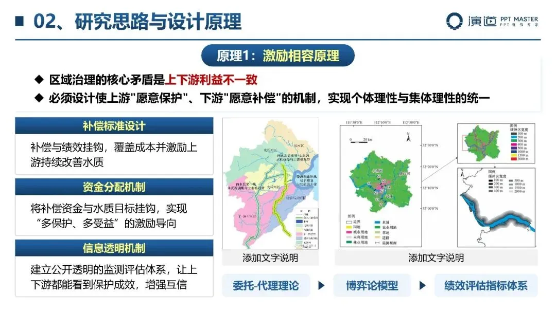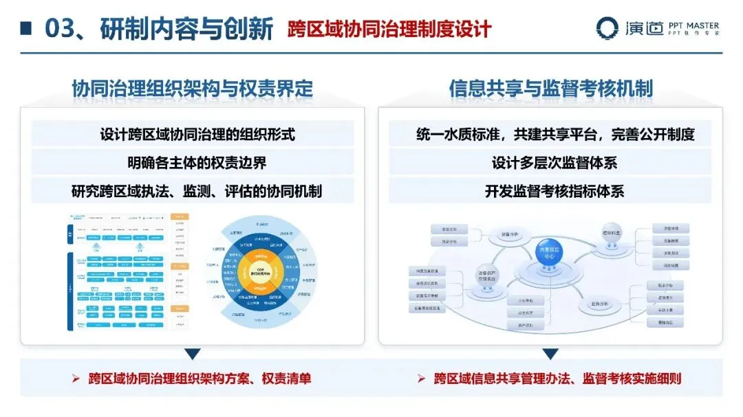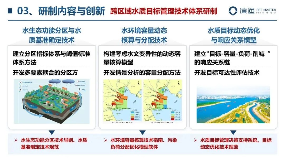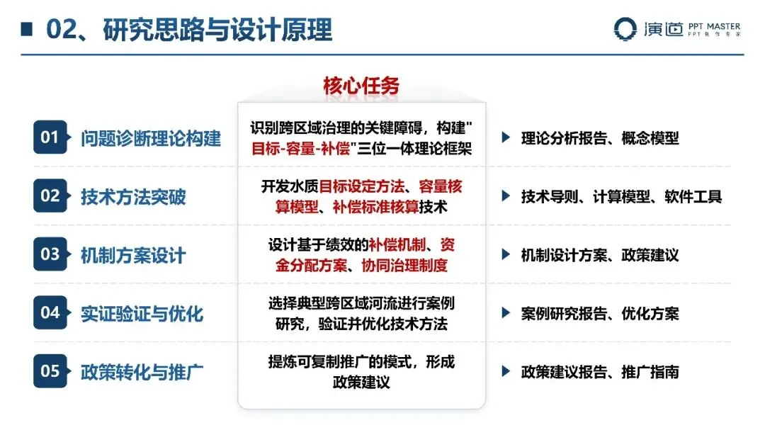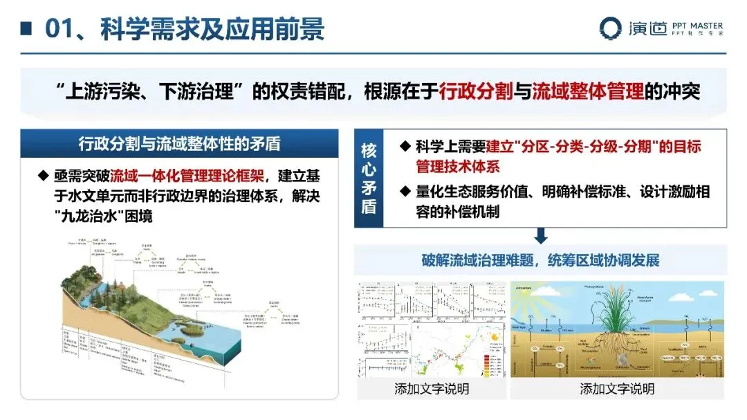 PPT 以 “科学需求 — 研究思路 — 核心创新” 为主线,先阐明流域治理的核心矛盾与科学需求,再提出 “问题诊断 — 技术突破 — 机制设计 — 实证验证 — 政策转化” 的全链条路径,最后从跨区域水质目标管理与生态补偿机制两大维度呈现技术突破,逻辑闭环、层次清晰,凸显项目的政策价值与实践意义。
