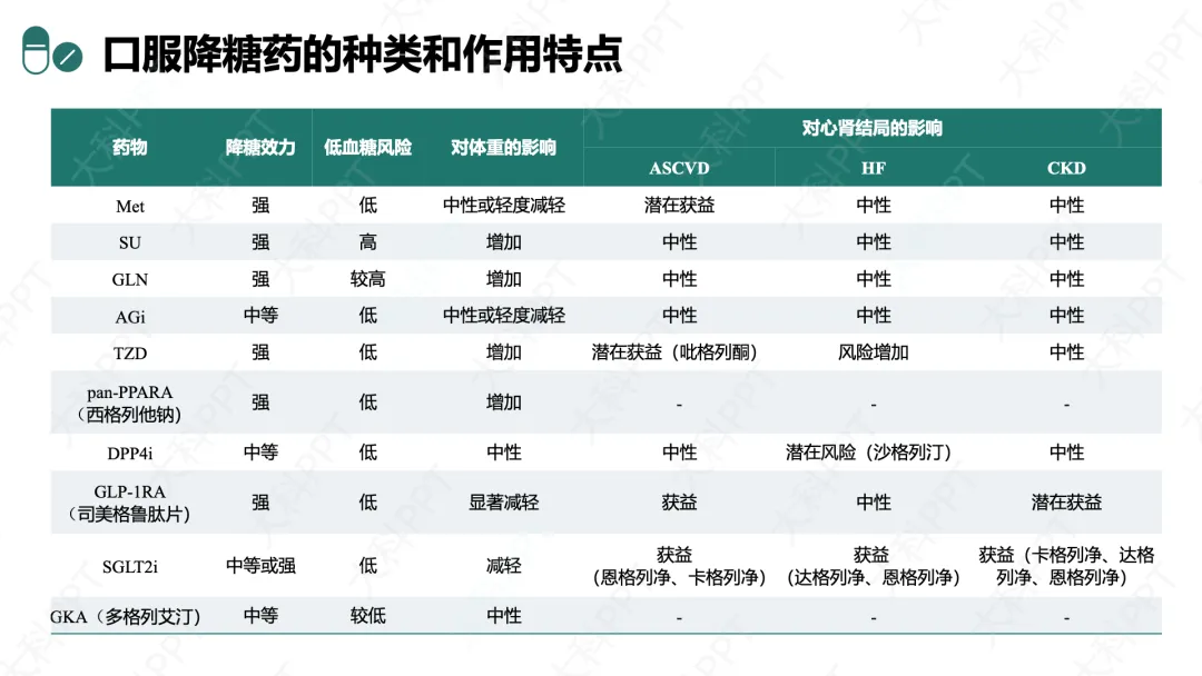 各类药物核心特点差异显著:降糖效力上,Met、SU、GLN、TZD、pan-PPARA、GLP-1RA 为强效,AGi、DPP4i、GKA 为中等,SGLT2i 为中等或强;低血糖风险方面,SU 最高,GLN 较高,GKA 较低,其余多为低风险;体重影响上,GLP-1RA 显著减轻,SGLT2i 减轻,AGi、Met 呈中性或轻度减轻,DPP4i、GKA 为中性,SU、TZD、pan-PPARA 则会增加体重。