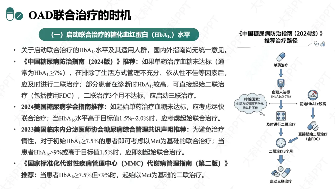 OAD 联合治疗的时机需结合血糖水平、患者病情综合判断。
